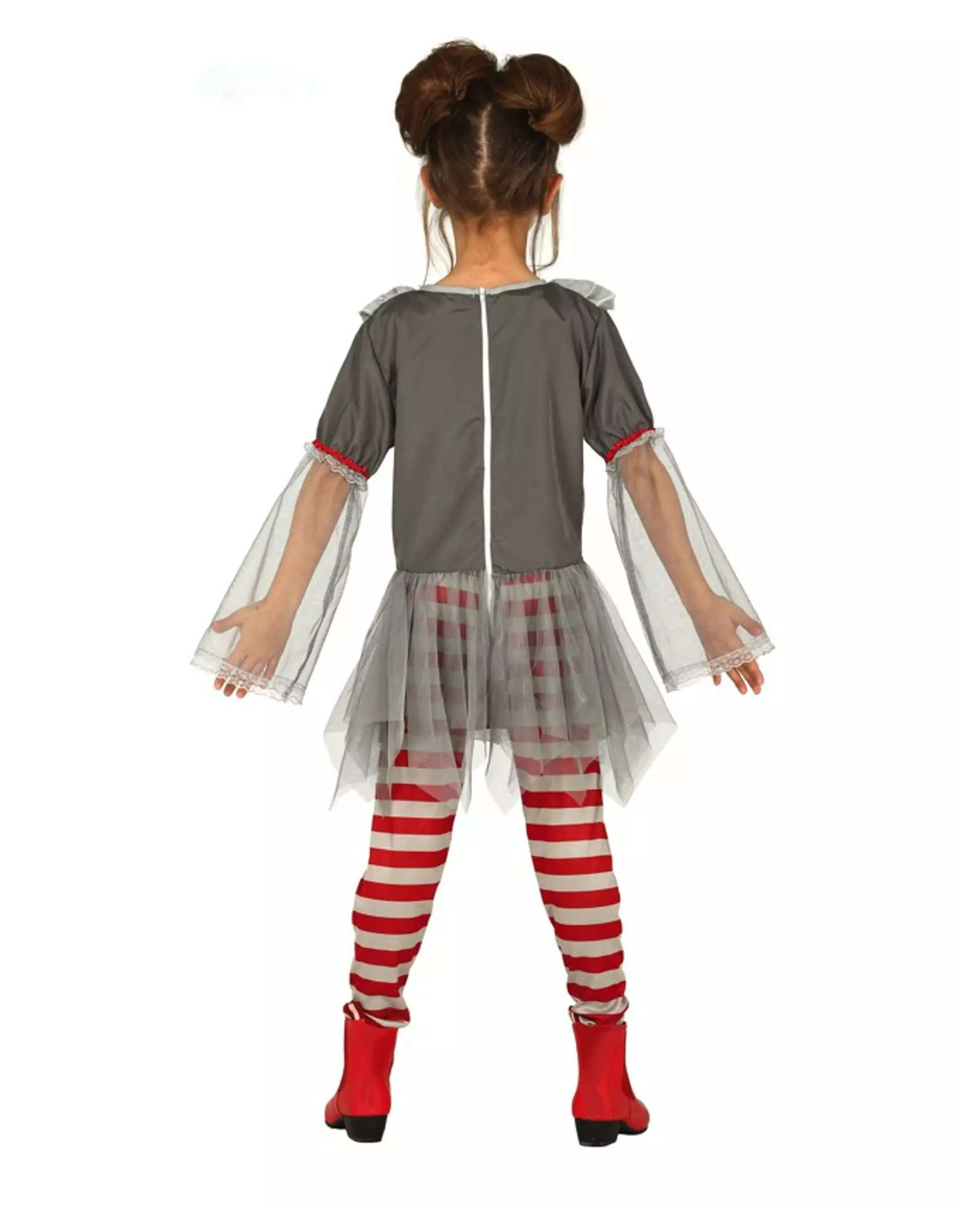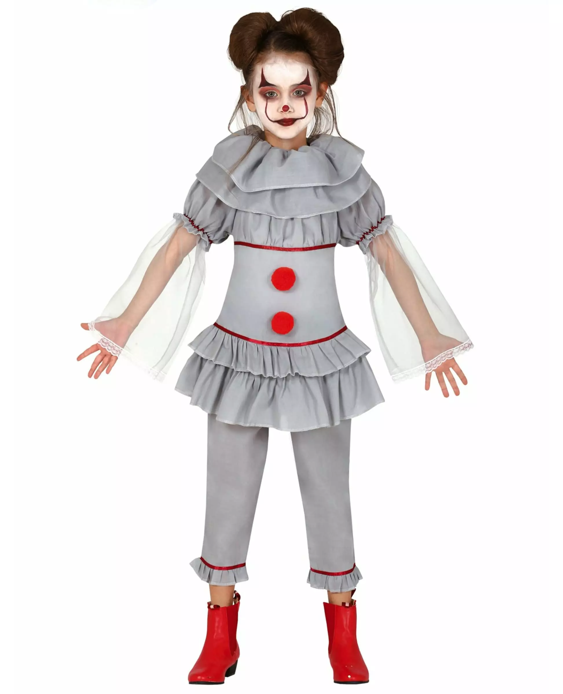 killer clown costume for Halloween! This killer clown costume for girls consists of pants, a dress, and a collar (shoes and makeup not included). The short pants and short dress are gray with red stitching. They are accompanied by a collar of the same color. This killer clown costume will be perfect for your daughter ready to hunt for candy on Halloween night!. Accessories included: 1 pants 1 dress 1 collar