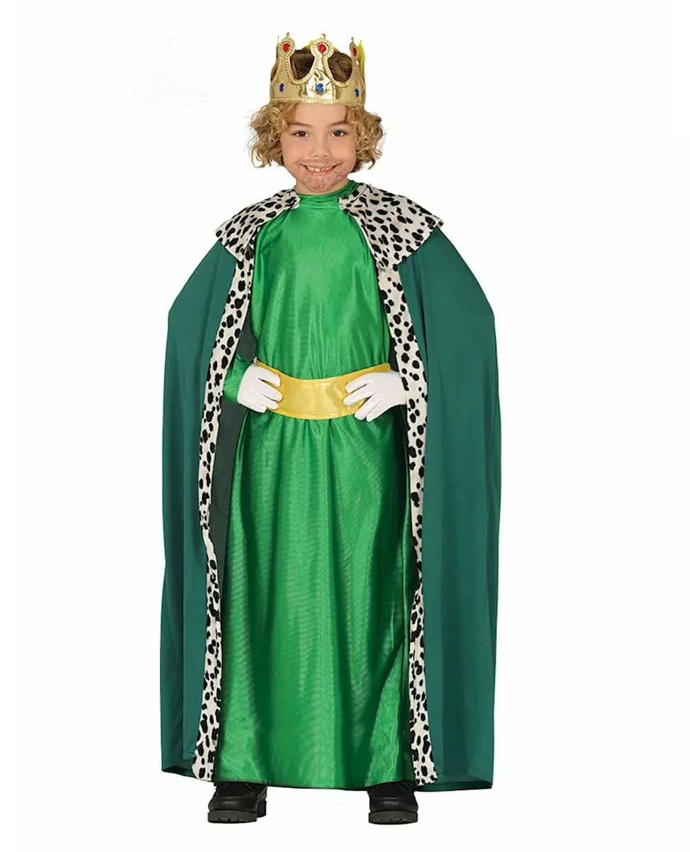 The Three Wise Men and their gifts are on their way This green Wise Man costume for children consists of a tunic, a cape and a belt (crown and gloves not included). The tunic is long. It is made of a green satin fabric. A golden belt to wear around the waist adds even more shine to this Wise Man costume. The long cape is also made of fir green fabric with a collar and edges in white faux fur with black spots. This complete Wise Man costume will be ideal for embodying one of the 3 Wise Men for the end-of-year celebrations. Accessories included: Cape, Tunic, Belt, Material: 100% Polyester,
