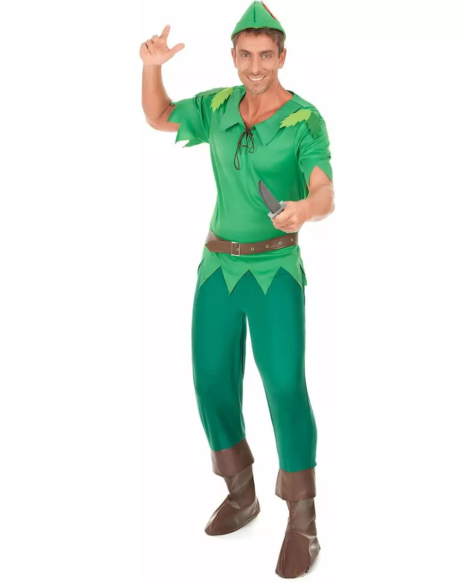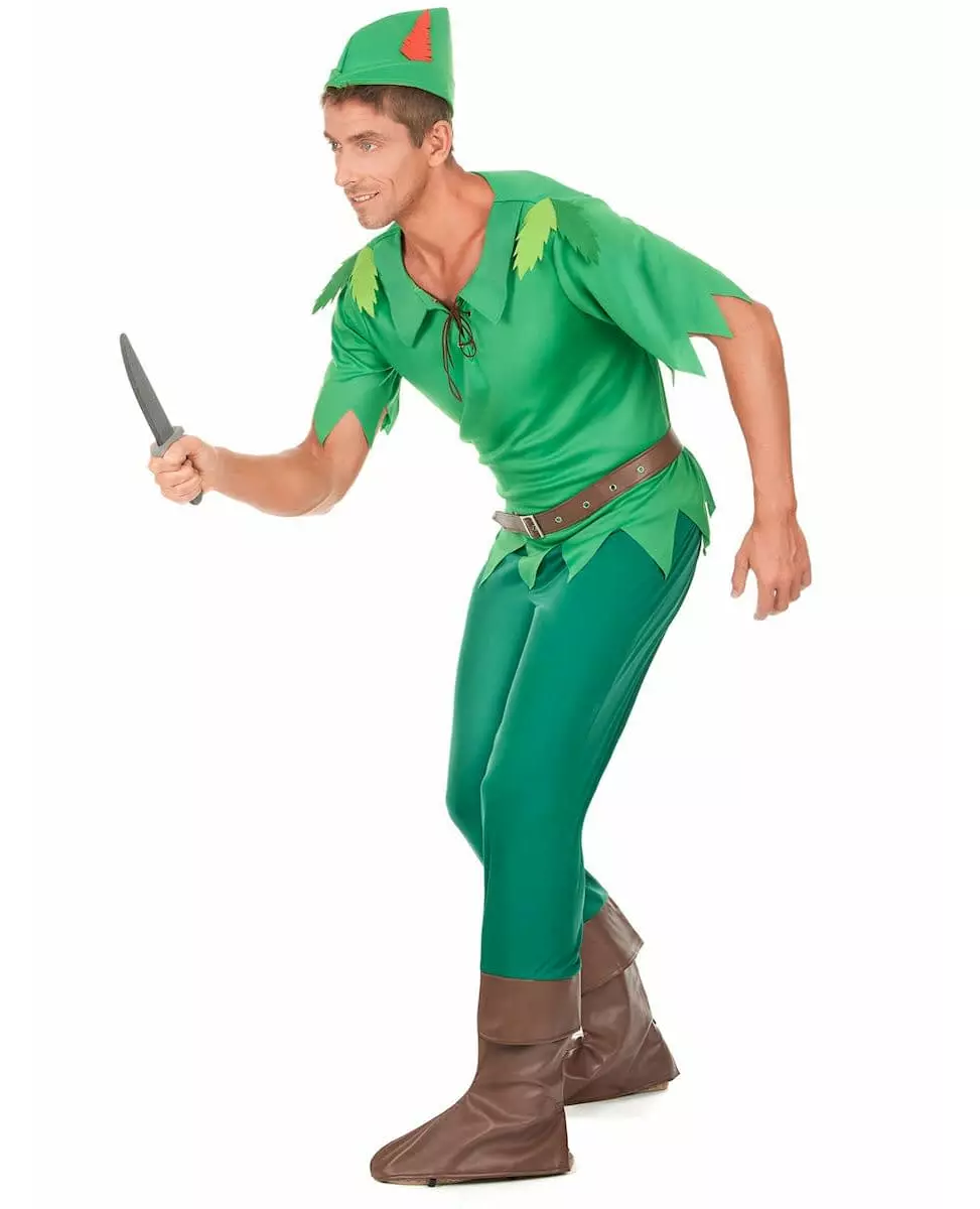 Take flight! This Neverland Man costume is for men and includes a t-shirt, pants, a hat, and a belt. The top is made of fine light green fabric with pointed sleeves. Felt leaves decorate the shoulders. A small lace, which you can tie as you wish, is present at the collar. The pants have an elastic waistband and are dark green. Brown boot covers are sewn onto them. Elastic bands will hold them to your shoes. The belt is brown like the boot covers. Its metal buckle will allow you to tighten it to your liking. Finally, the hat is the same green as the t-shirt. It is made of thick fabric with a small red felt feather on the side. This very complete costume will make you the child in you for a fancy dress or theme party. Accessories included: Top Hat Pants with boot covers Belt Material: Polyester