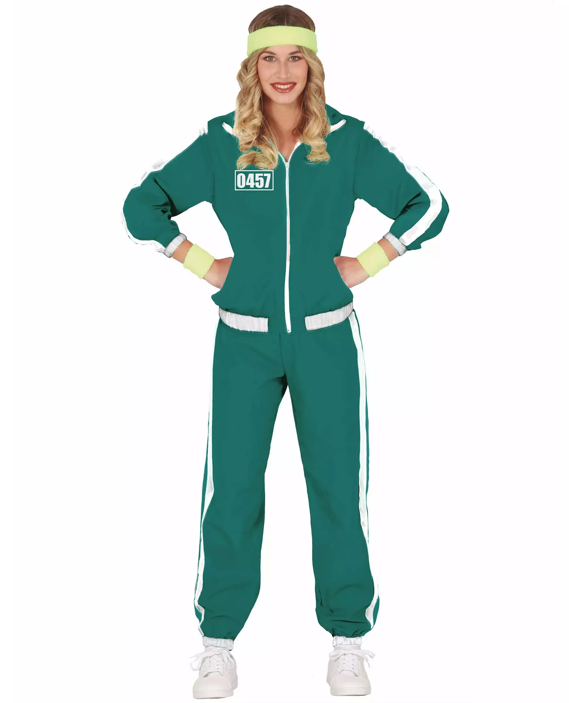 Who will be the last one! This participant tracksuit is for women and consists of a jacket and pants. The jacket is green and has a white zipper. It is decorated with white stripes on the sleeves and has the inscription "0457". The tracksuit bottoms are the same color as the jacket and have white stripes on the sides. They are tightened at the ankles. Will you be the 457th participant of 1,2,3 sun with this tracksuit during Carnival or Halloween?! Accessories included: Jacket Pants Material: 100% polyester Care: Hand wash