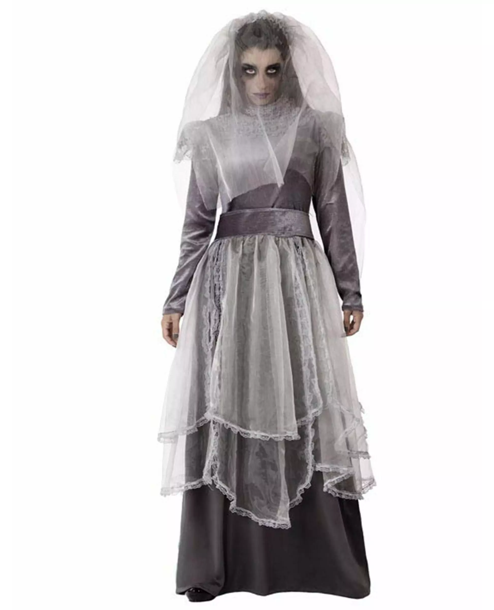 Bring out the wedding dress for Halloween This funeral bride costume for women consists of a dress, an apron and a headpiece. The wedding dress is gray. Not over it, at the waist, you only have to put the apron. It has a gray belt, on which are attached long pale gray veils. Finally, the headpiece represents a faded bridal veil. This costume will be perfect for haunting the streets in search of your lost soulmate on Halloween night. Material: polyester. Accessories included: Dress Veil Apron Care: Hand wash