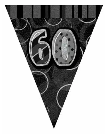3.6 m long and 30.5 cm high pennants This bunting is 3.6 meters long and 30 cm high. It is black in color with the number 60 on the pennants representing the age 60. Attach it to the ceiling for a truly festive effect. The age 60 pennant garland is perfect for celebrating this birthday in your honor. Unique party branding. Accessories included: 1 Garland