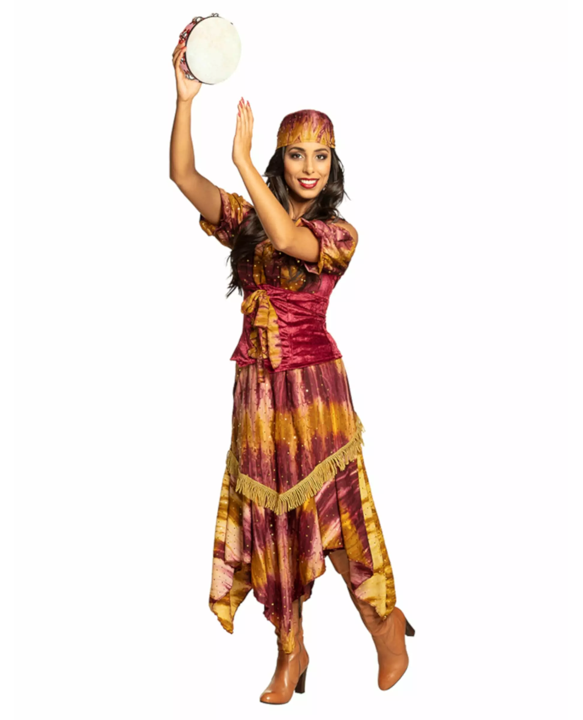 Add color to your evenings in this gypsy costume. This gypsy costume for women consists of a top, a skirt, and a bandana (shoes and tambourine not included). The short-sleeved top is red with a bow under the chest. The sleeves and chest are made of a fabric in shades of yellow and plum. It closes in the back with buttons. The gypsy skirt is plum and yellow, with fringes in the middle. Finally, a matching bandana is included and simply ties around the head. This costume will be perfect for playing Esmeralda for a day during Carnival. Accessories included: Top Skirt Bandana Material: 100% polyester Care: Hand wash