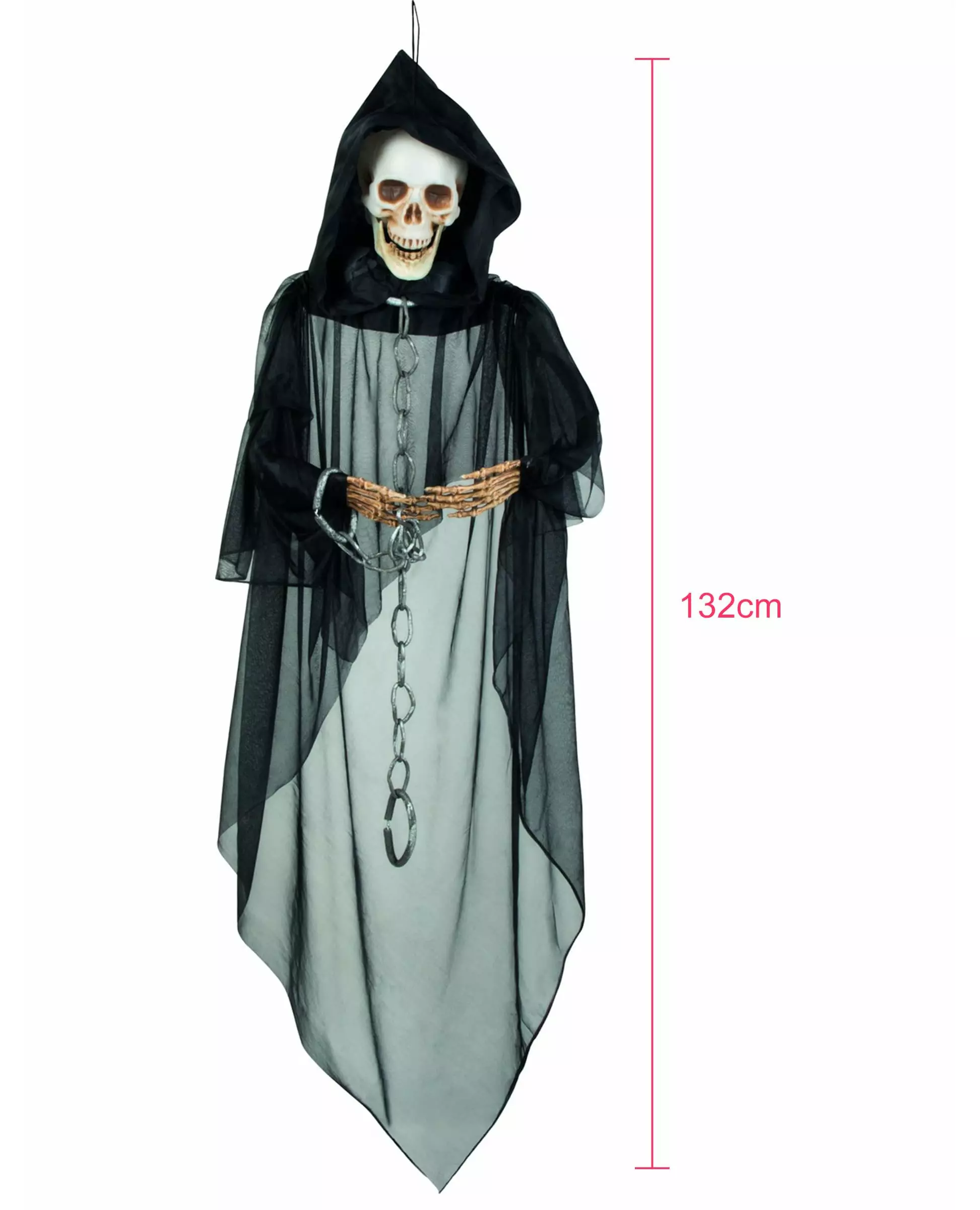 Ghost Skeleton! This hanging decoration is a skeleton dressed in transparent black fabric. Gray foam chains hang from its wrists. They are connected to the skeleton's neck. You can remove them from the wrists to let your character's ties hang. It measures approximately 132 cm in height. The head is made of hard plastic and the details are quite neat. The same goes for the hands. Thanks to the cord attached to the top of the product, you can attach it anywhere and thus have a decoration in the spirit of Halloween!. Accessories included: Hanging decoration Material: Plastic and Polyester