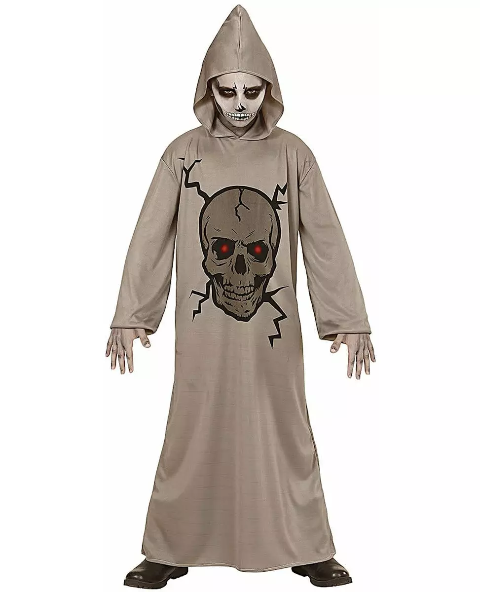 Trick or treat! This grim reaper costume is a long hooded tunic. Entirely gray, it features a skull with piercing red eyes and a terrifying expression! The hood adds a touch of mystery when pulled over the head! Stroll the dark streets of Halloween with your child dressed as a grim reaper and scare passersby!   © Copyright Widmann SRL. Accessories included: tunic Material: 100% polyester Care: Hand wash Measurement information: For a size 5/7 years, the tunic measures approximately 103 cm.