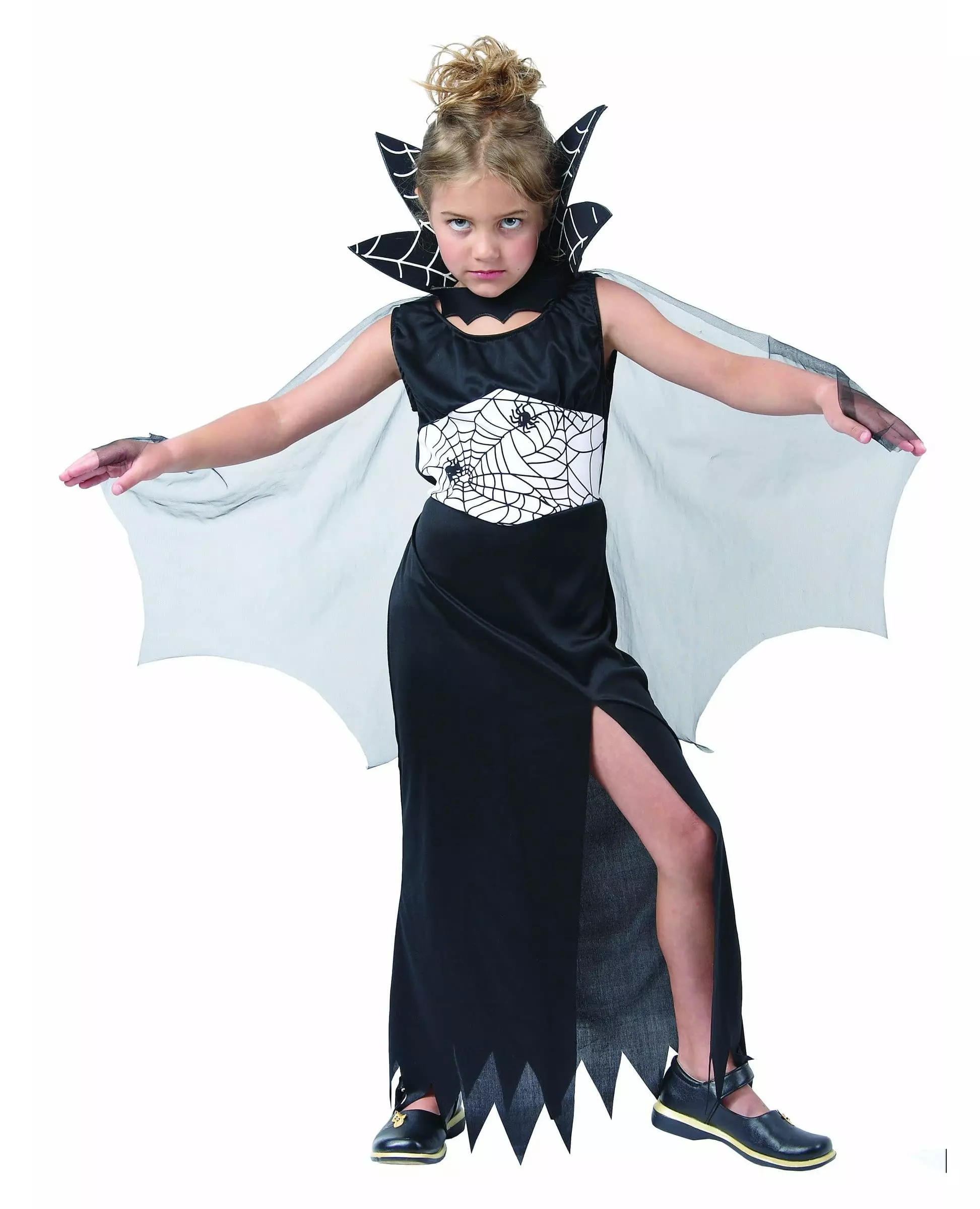 With a sheer black veil cape! This Halloween spider witch costume for girls consists of a long black lace dress with a white spider web print on the front. The outfit also includes a sheer black veil cape with a stiff foam collar that attaches with a Velcro fastener under the chin (shoes and tights not included). This costume will be ideal for Halloween night or any other fancy dress event. Accessories included: Cape dress Material: 100% Polyester Care: Hand wash