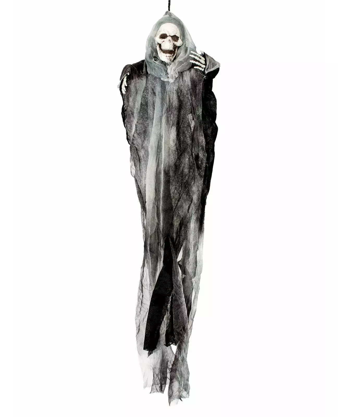 The Grim Reaper Welcomes You This hanging grim reaper in rags is composed of a plastic head, two deformable arms ending in skeleton hands, and torn fabric patches. With its arms open, it measures approximately 60 cm in wingspan and 1 meter in height. It will be perfect for setting the tone for your spooky evening at your Halloween party. Accessories included: Hanging Material: Plastic and Polyester