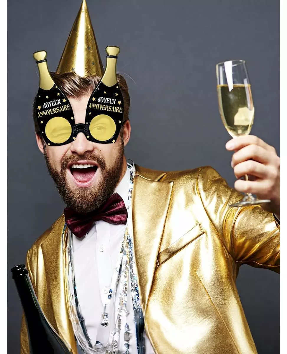 Ideal for your birthday! This pair of adult birthday glasses is made of plastic. It represents 2 green champagne bottles with red and yellow striped tops and the words "Happy Birthday!" surrounded by stars. The lenses of these glasses are dark green. This accessory will be perfect to complete your outfit on your birthday. Accessories included: Pair of glasses Material: Plastic
