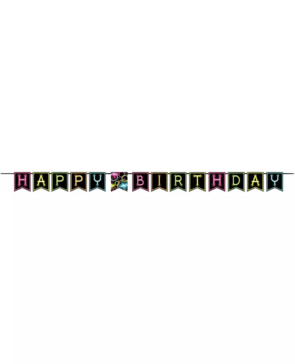 Color on the walls! This garland measures approximately 2.7m. With its 14 pennants each measuring approximately 15.2cm, it is entirely black with multicolored details! All the pennants form the expression "HAPPY BIRTHDAY" with, in the center, a pennant decorated with neon lights to immerse you directly in the 80s! In addition, the garland is easily attached to the wall using discreet white strings. Perfect to complete a colorful birthday decoration!. Accessories included: garland Material: Cardboard