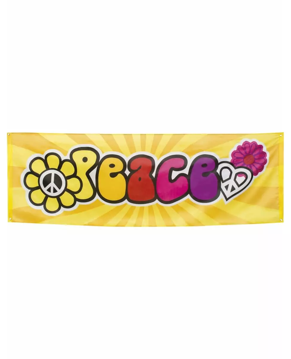 Flower Power! This banner is made of fabric. It measures 220 x 74 cm. The word "Peace" is written in colorful letters ranging from yellow to purple. Find an image of a flower, a heart and a Peace symbol. The background is yellow and orange like a halo of light. This banner will be perfect for your Hippie themed party. Accessories included: Banner Material: Fabric