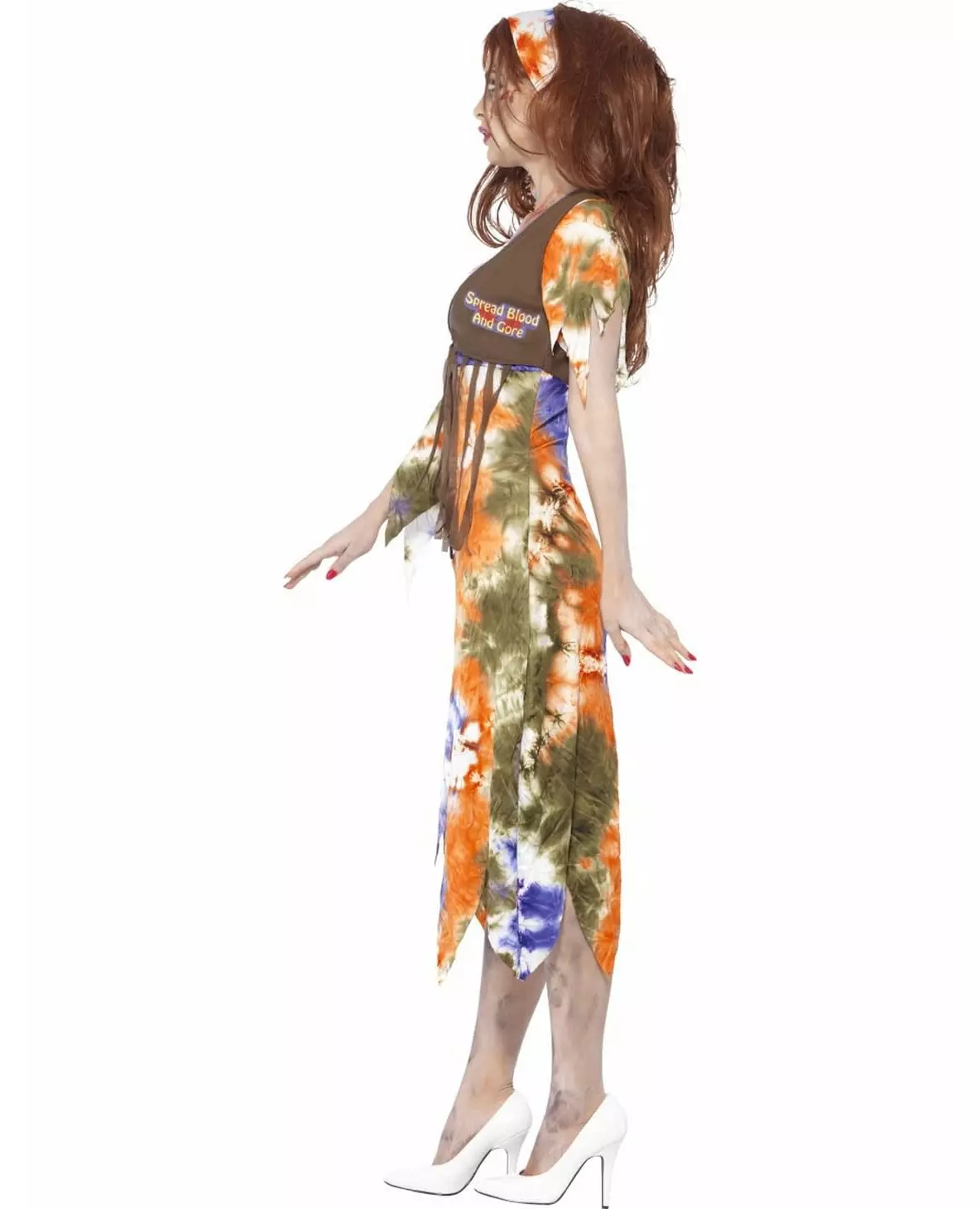 Look for new victims on Halloween night This hippie zombie costume for women consists of a dress and a headband (glasses and shoes not included). The colorful dress has a faded effect. The bottom of the dress and sleeves are cut into points. A brown vest is sewn directly onto the dress. It has long fringes on the front. This fake vest closes at the front with ties at the front. The headband, matching the dress, is tied around the head. This hippie zombie costume will be perfect for terrifying your guests on Halloween night. Accessories included: Dress Headband Material: 100% Polyester Care: Hand wash