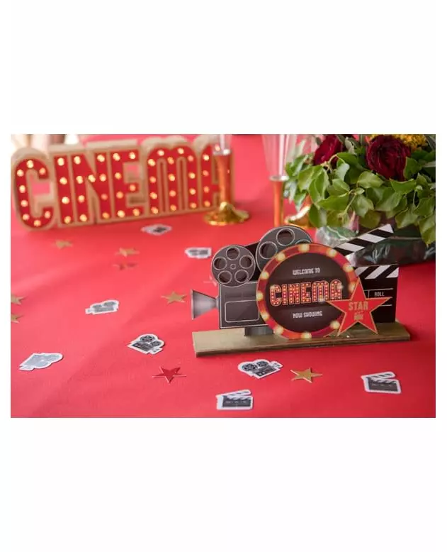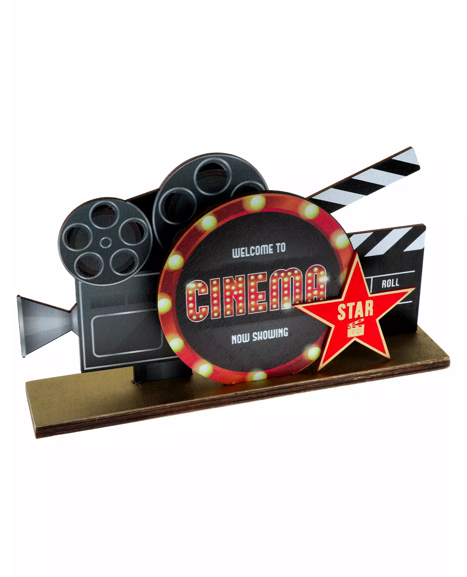 real movie scene! This centerpiece measures approximately 20 x 13 cm. It is made of wood and represents different elements of cinema. It is decorated with a camera and a movie clapperboard. The inscription "Welcome to cinema" decorates the front of the centerpiece. It is written inside a round red frame. A magnificent red star with gold edges bears the inscription "STAR" and is decorated with a gold-colored clapperboard. The decoration rests on a rectangular wooden base. This centerpiece is perfect to complete your cinema-themed table decoration for a birthday!. Accessories included: 1 Centerpiece Material: Wood