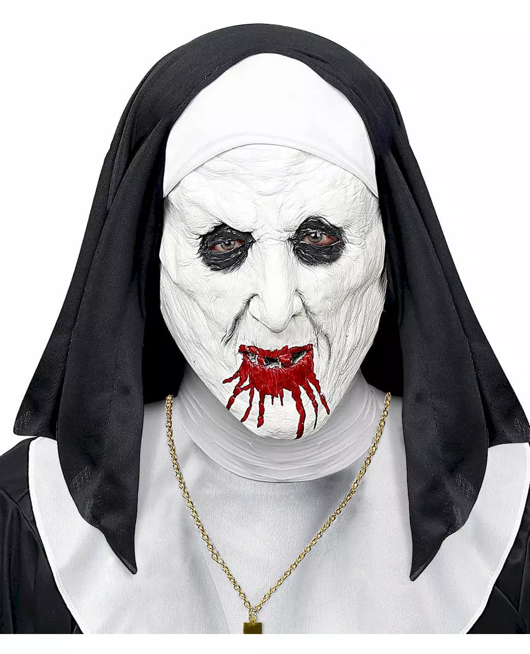 For Halloween, put on the terrifying nun mask and torment your victims... This mask represents the head of a terrifying nun. The face is entirely white with quite pronounced features. The eye contour is black and the mouth is bloody red! The headdress is black and white like that of a nun. If you come across this face on Halloween night, we strongly advise you not to confess and to run away! Accessories included: Mask Material: 100% polyester Care: Hand wash