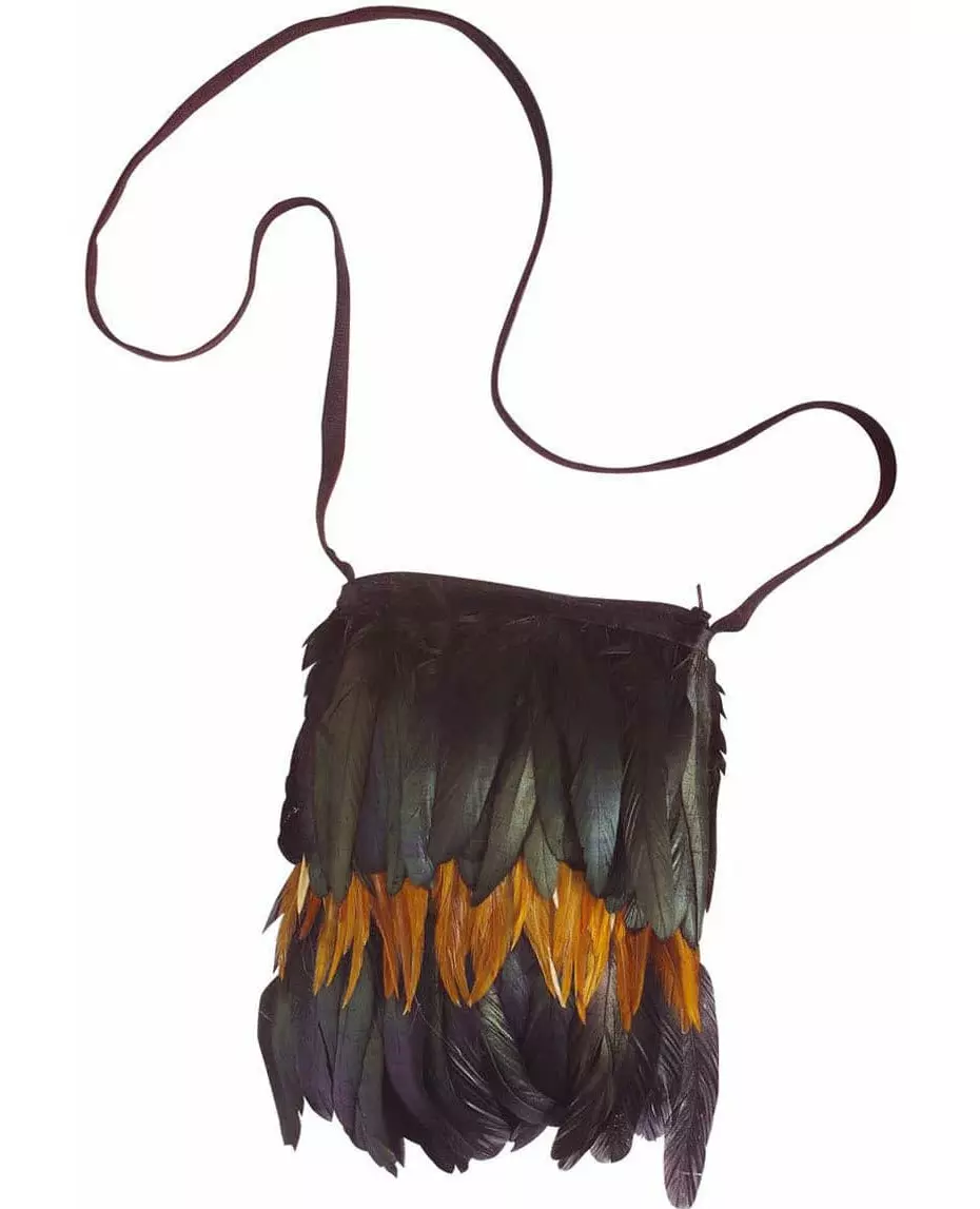 Become a great Indian chief and fight against the cowboys of the West This Indian satchel measures approximately 20 x 28 cm. It is decorated, on the front and back, with black feathers with green highlights and caramel-colored feathers. It closes with a zipper. A link will allow you to carry this satchel across your shoulder. This accessory will be perfect to complete your Sioux chief costume during a western-themed evening or for Carnival. © Copyright Widmann SRL. Accessories included: Satchel
