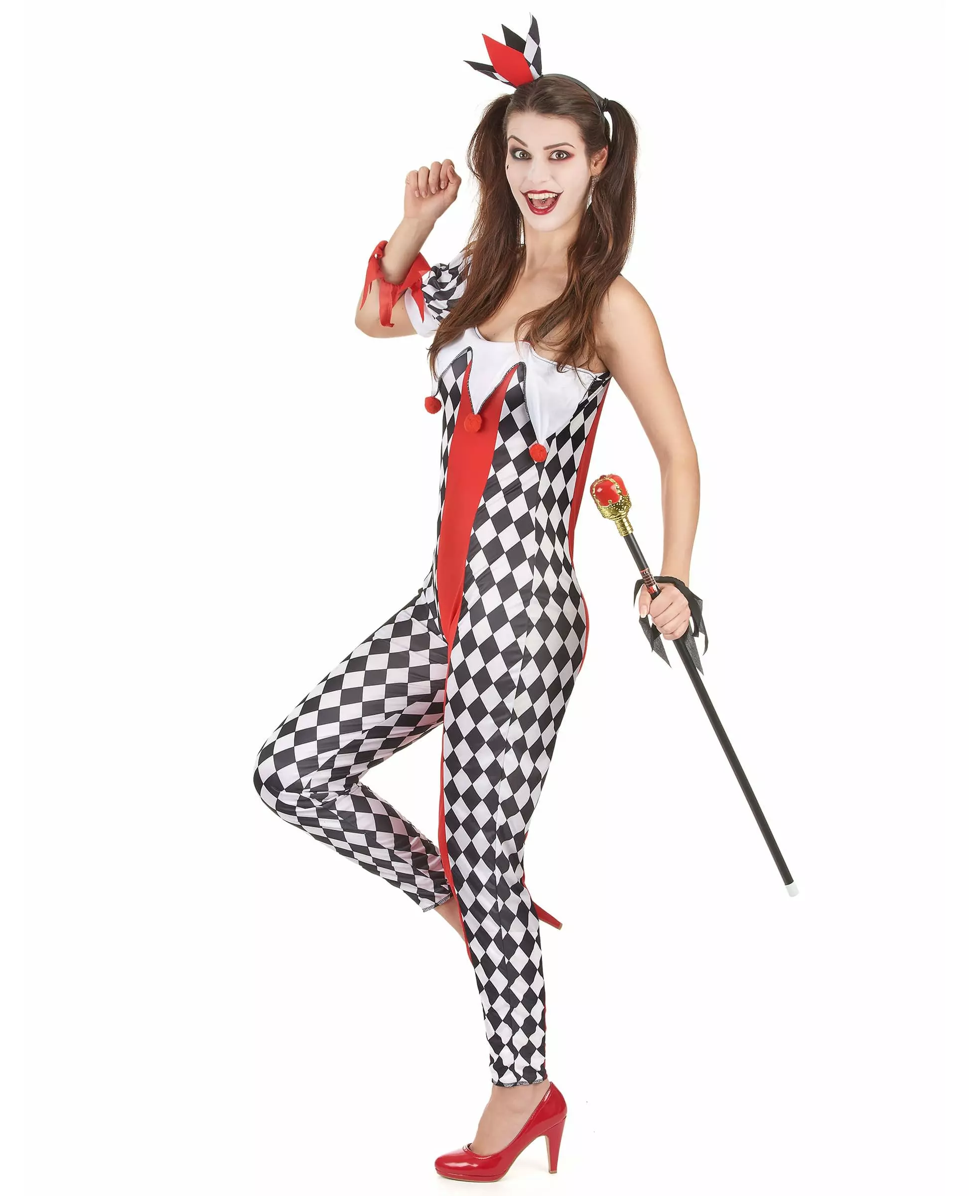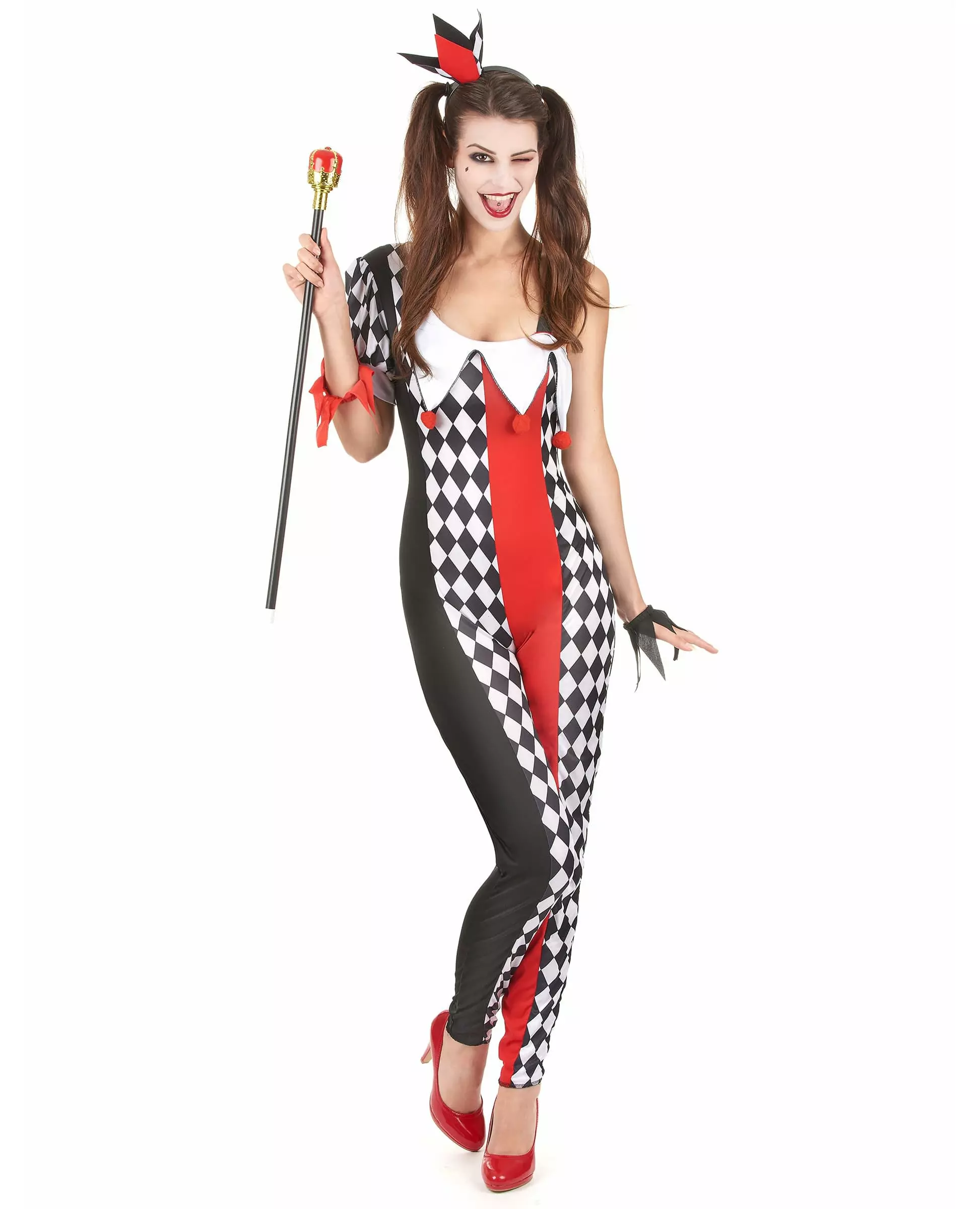 The Joker's true love! This Joker costume is for women and includes a jumpsuit, two cuffs, and a headband (scepter sold separately and shoes not included). The jumpsuit has long legs and a short sleeve on one side. The outfit is therefore asymmetrical. A black strap will keep the outfit in place. Right at the front, the neckline is decorated with white fabric cut to a point and embellished with red pompoms. The print of the outfit shows a solid red section, another black section, and a final black and white checkered section. The two small black and red sleeves are elastic and made of pointed fabric to recall the neckline. The headband is made of plastic topped with a thick felt crown, whose prints recall those of the jumpsuit. During Carnival or for any other fancy dress occasions, play at being the bad guys' friends with this costume with such familiar looks. Accessories included: Jumpsuit Headband 2 Sleeves Material: 100% Polyester Care: Hand washable