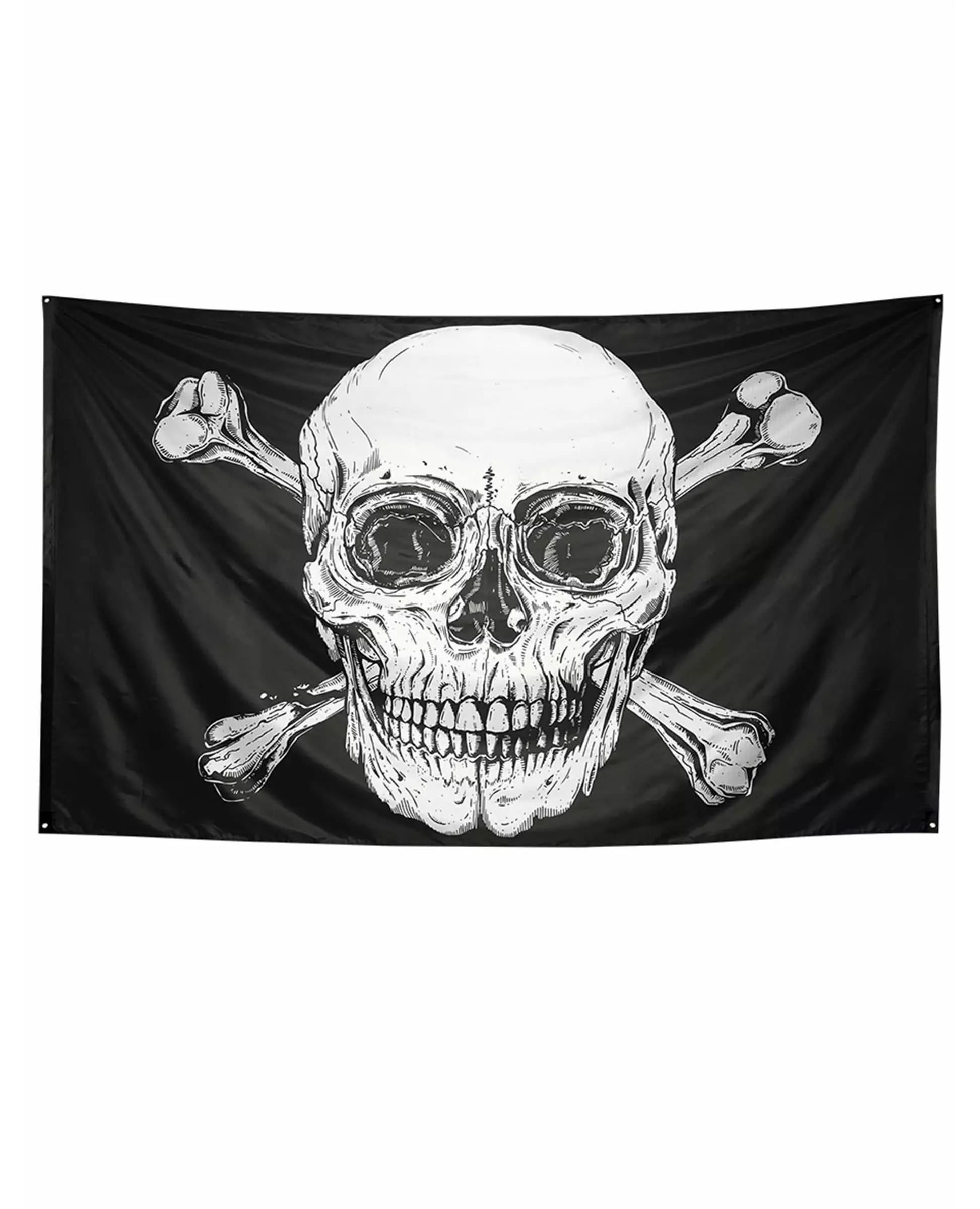 An XXL pirate flag for your ship! This fabric flag features a skull on a black background. It measures approximately 300 cm long and 200 cm wide. Small eyelets are provided for easy hanging. Complete your pirate decor with this large flag for a themed party! Accessories included: 1 XXL Flag