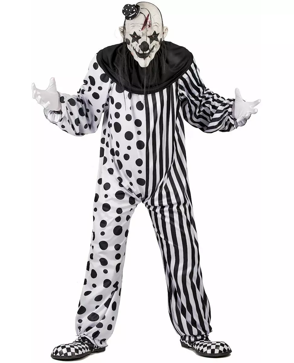 Dress up as a creepy clown for Halloween This fantastic horror clown costume is for adults and includes a jumpsuit and a mask. The clown costume has elasticated wrists and ankles to create a traditional look. A black satin collar and an asymmetrical print complete the clownish look of this costume. The mask is made of latex and is full-face and has some scattered long hair. For a horror night where If you don't want to be recognized, this costume will be ideal for Halloween night, for example! Accessories included: Jumpsuit Mask