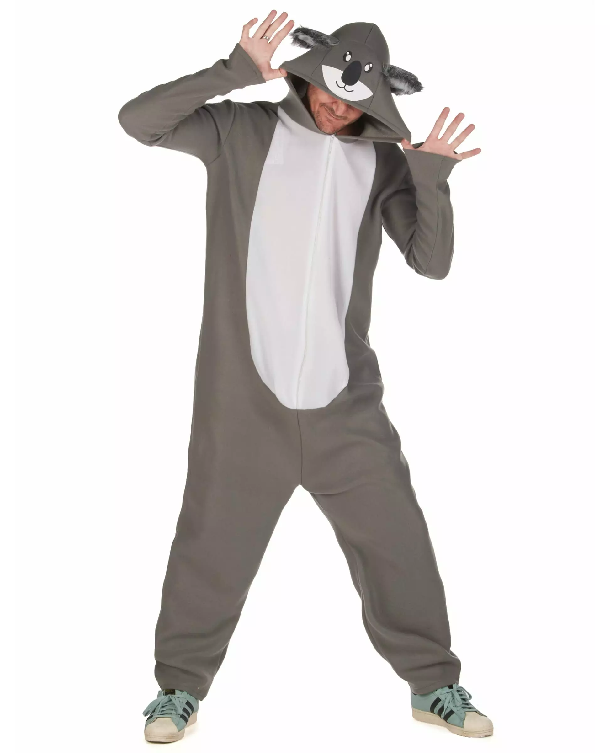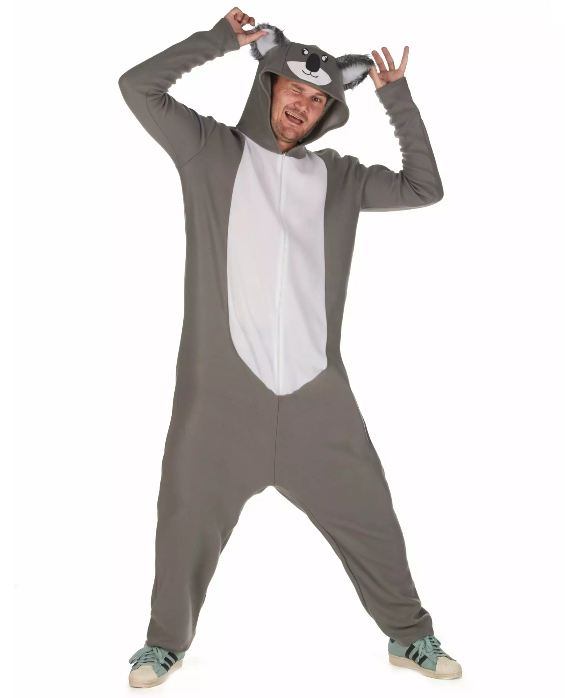 koala costume to keep you warm! This men's koala costume includes a hooded jumpsuit. The long-sleeved jumpsuit is gray with a white belly. A zipper on the front will allow you to put this costume on and take it off easily. The hood is topped with a cute k