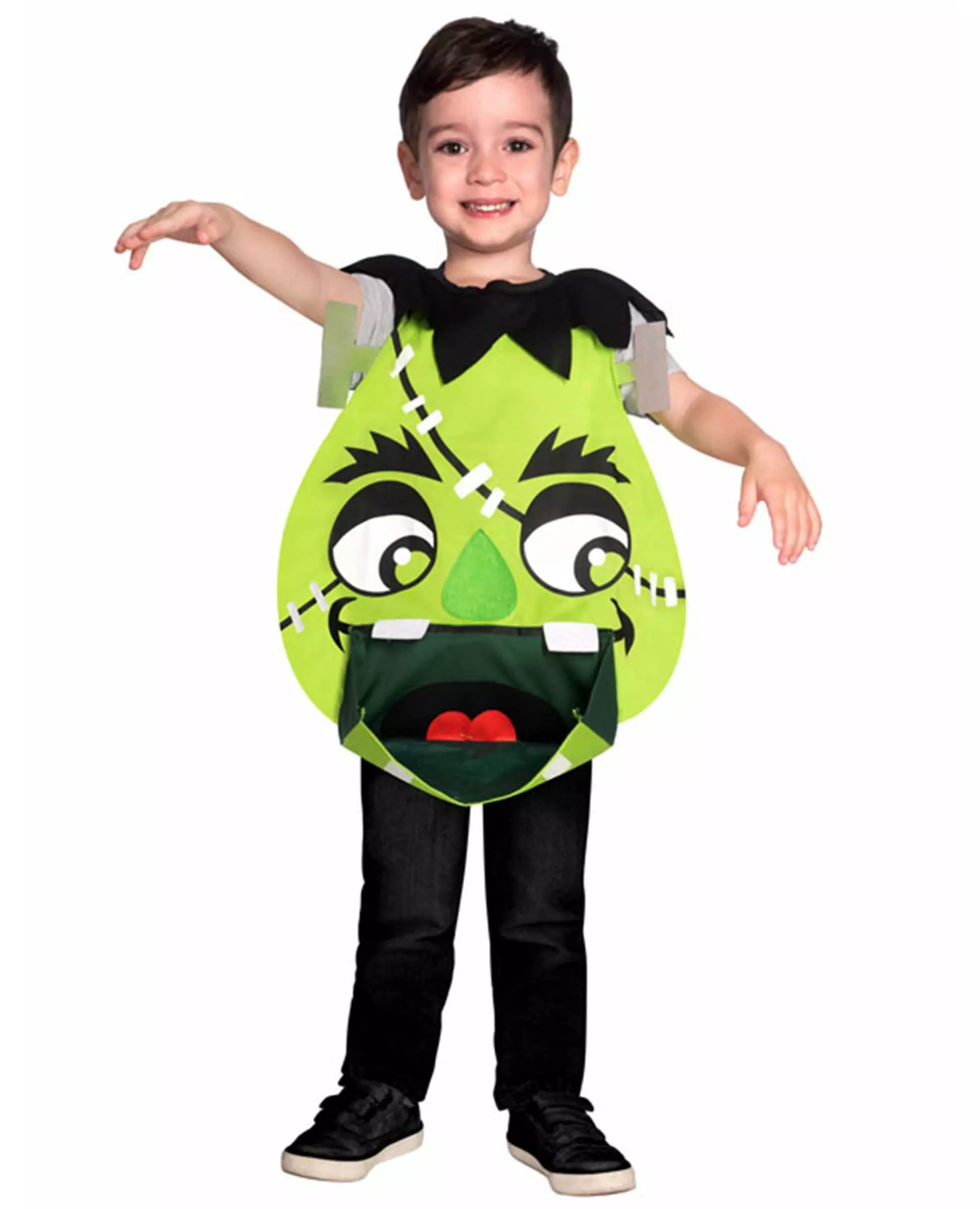 Dress up as an adorable green monster for Halloween! This little monster hiding apron costume is for children and includes an apron (t-shirt, pants and shoes not included). The apron represents a green monster with black hair as a collar. It has large scars and large green eyes. Its mouth is open and allows you to slip all sorts of small things like candy. Your child will love going trick-or-treating with this little monster hiding apron costume on Halloween night!. Accessories included: 1 apron Material: Polyester