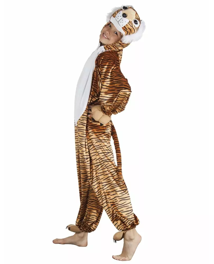 Your child will roar with delight! This children's costume consists of a jumpsuit and a removable tiger tail. The jumpsuit is striped orange and black. A padded hood forms the head of a cute tiger. The ends at the hands and feet are elastic and feature foam clawed paws. The back is plain and the front features an oval white spot. The jumpsuit closes with a zipper that runs from the neck to the crotch, over the white mark on the stomach. Two small invisible pockets are located on the sides. The removable tail is made of foam and can be attached to the back of the costume using Velcro. It measures 35 cm. The whole is made of velvet-effect polyester. Transform your little monster into an adorable tiger for Carnival or a fancy dress party. Accessories included: Jumpsuit Tail Material: Polyester Care: Hand wash Measurement information: For size 6/8 years: 110 cm jumpsuit for a child of 116 cm max. For size 8/10 years: 116 cm jumpsuit for a child of 122 cm max.