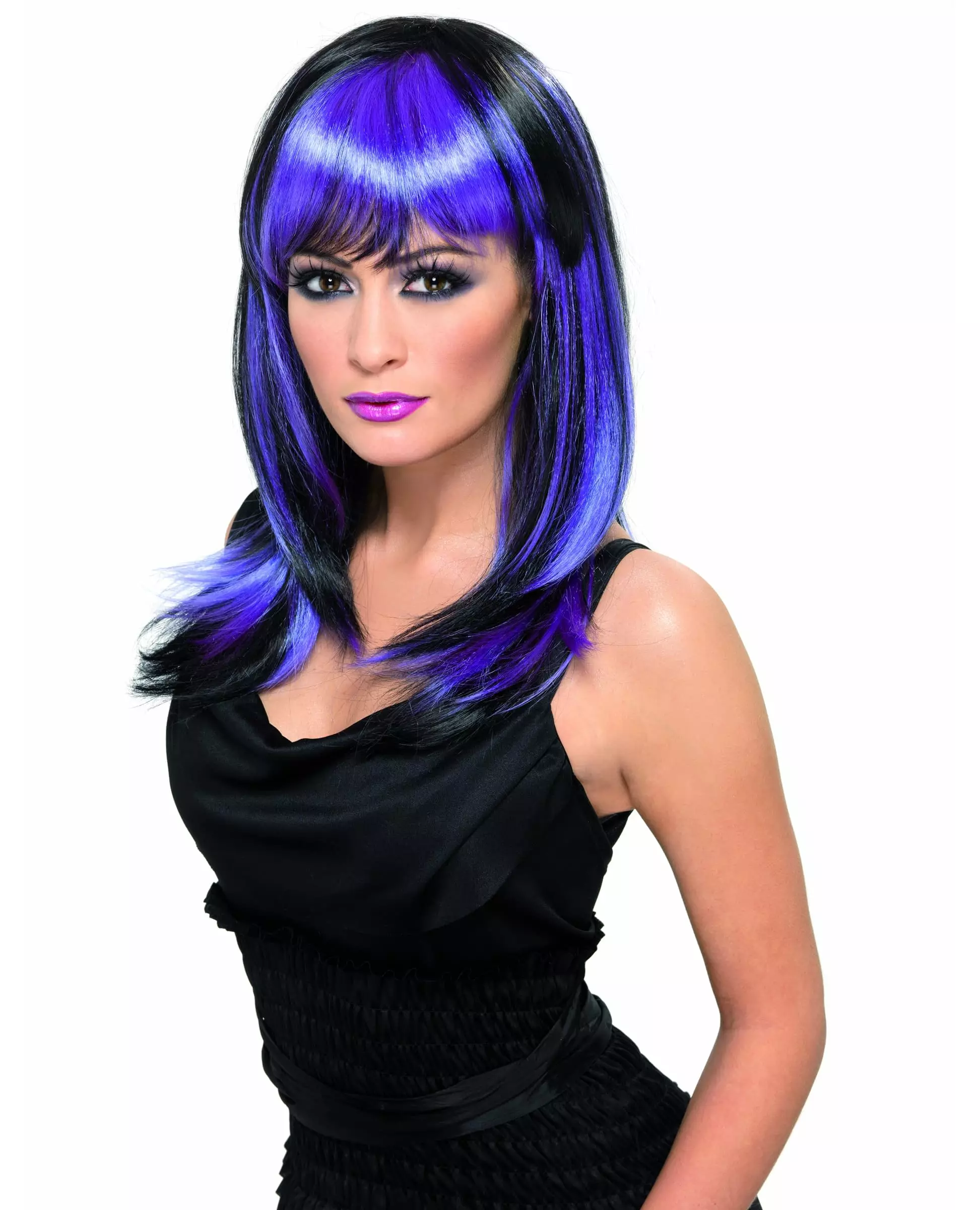 Natural effect! This long black wig with bangs has a natural effect with superb purple highlights. It will be essential to enhance your costume for Halloween or any other fancy dress event. Material: 100% Polyethylene 100% Polyethylene