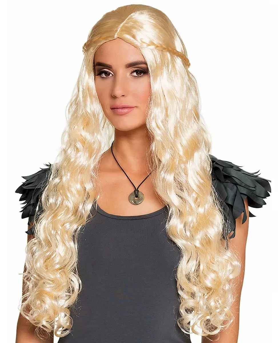 flamboyant queen! This long, wavy blonde wig with synthetic hair. Two small braids surround the head, like medieval hairstyles. This wig will be perfect for accessorizing your queen or princess costume for TV series-themed parties, or even for carnival!. Accessories included: Wig Material: 100% polyester Care: Hand wash