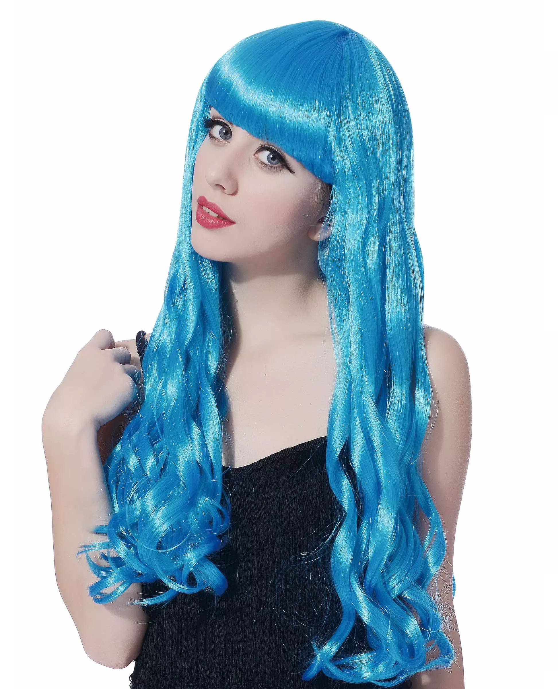 Accessorize your costume with electric blue! This long wig for women is made of synthetic hair. The latter measures approximately 70 cm and is wavy. A straight fringe is also present and will cover your forehead. Electric blue in color, it will be perfect to accompany a mermaid costume for example during your evenings with friends. Accessories included: Wig Material: Synthetic 100% Polyester 100% Polyester