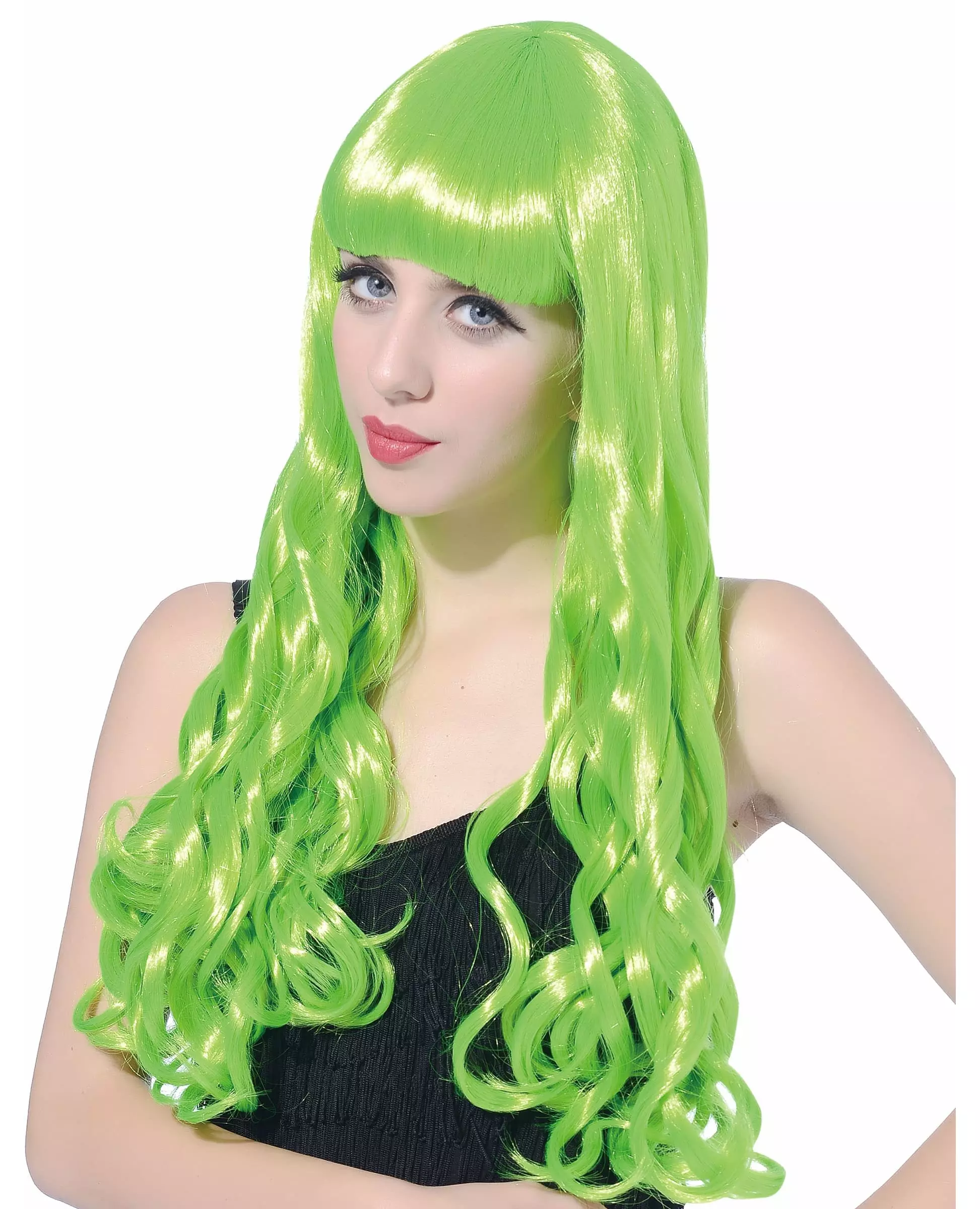 Add some color to your haircut This women's wig has long, wavy hair. These also form a fringe that will cover your forehead. They are neon green in color. This wig will be perfect to complete a colorful outfit for Carnival or a costume party with friends. Accessories included: Wig Material: Synthetic