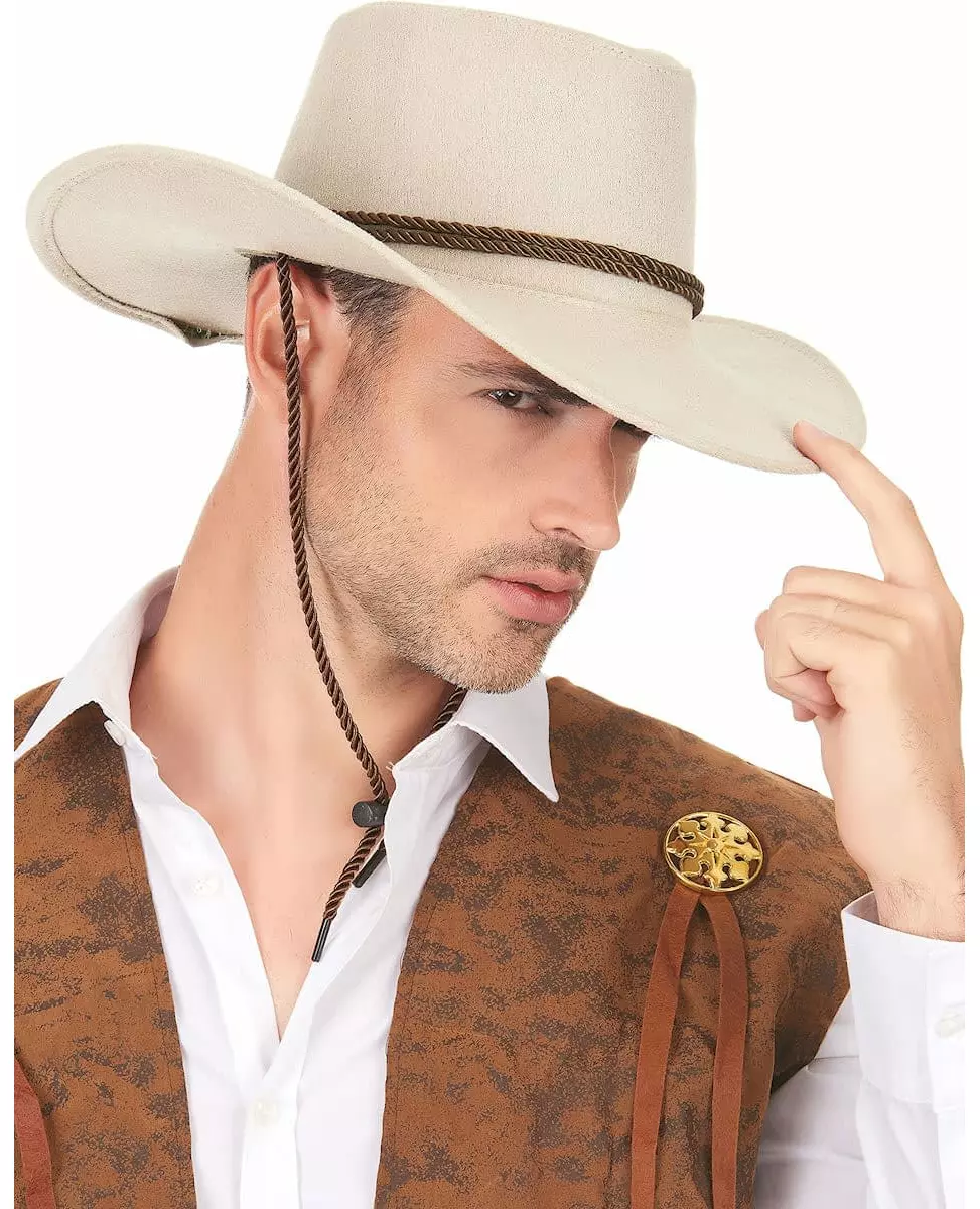 HIIIIHAAAA!!! This superb cowboy hat is beige with a suede leather type feel. A brown braided string goes around the hat and will be passed under your chin so that you can wear it traditionally in the back! The head circumference is approximately 58 cm. It will be ideal to complete your cowboy costume for a show or for carnival!. Accessories included: Hat Material: Polyester