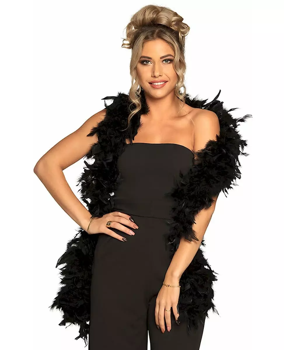 Add a touch of mystery and elegance to your outfit! This 80g black boa measuring 180cm is the perfect accessory to enhance your look with a touch of sophistication. Thanks to its light texture and voluminous feathers, it guarantees you a chic and timeless look. Ideal for New Year's Eve, a theme party, a cabaret costume, or any glamorous event, this black boa goes perfectly with all your outfits for an elegant and captivating effect. Easy to Easy to wear and pleasant to the touch, it is the essential accessory to shine with class and refinement during your special occasions. Accessories included: 1 Boa Material: 98% turkey feather and 2% cotton