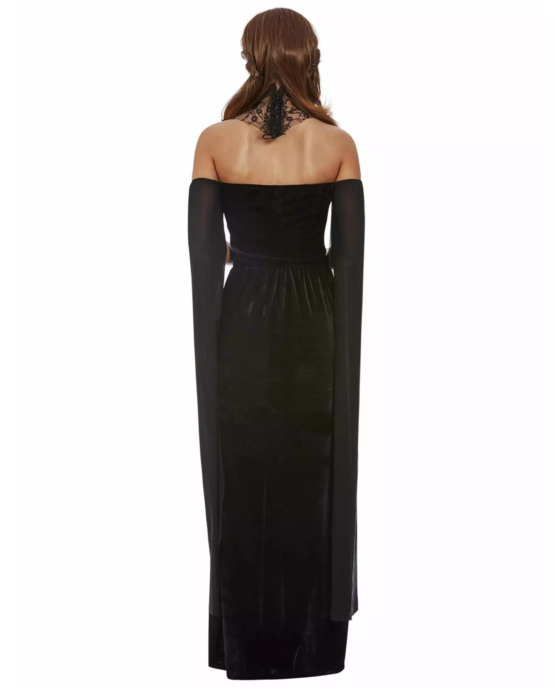 Embody the Black Countess for Halloween! This Countess costume consists of a dress and a choker (mask and wig not included). The dress is long and black with a velvet effect. The sleeves are long in black veil and fall on the arms revealing the shoulders. The top of the dress is a heart-shaped bustier. It is gold in the center and is decorated with black patterns. The collar looks like black and transparent lace. It attaches with a lacing at the nape of the neck. Be chic for your Halloween party with this Black Countess costume! Material: POLY (100.0%). Accessories included: Dress Collar Care: Hand wash