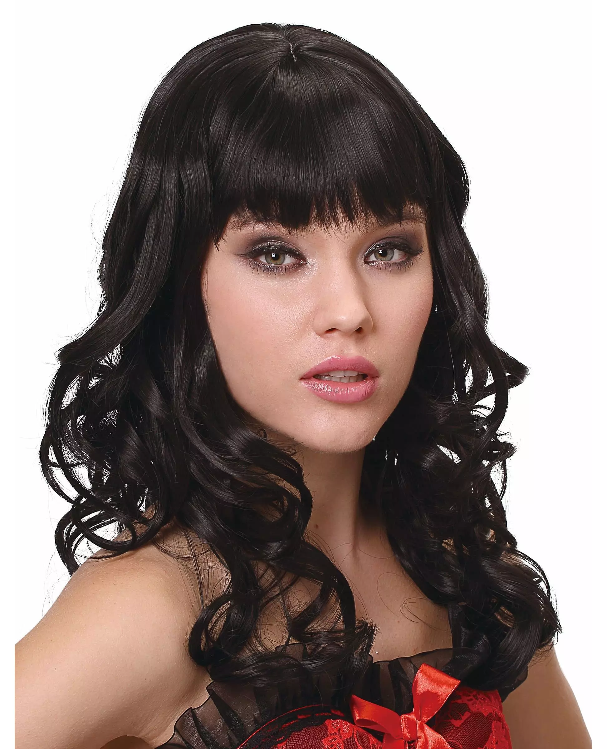 Beautiful ebony hair This magnificent black wig is made of black synthetic hair structured into beautiful curls over 3/4 of the length. A tapered fringe completes this very beautiful headdress. This wig will be perfect to complete any costume during your fancy dress parties. Accessories included: Wig Material: Synthetic 100% Polyester 100% Polyester