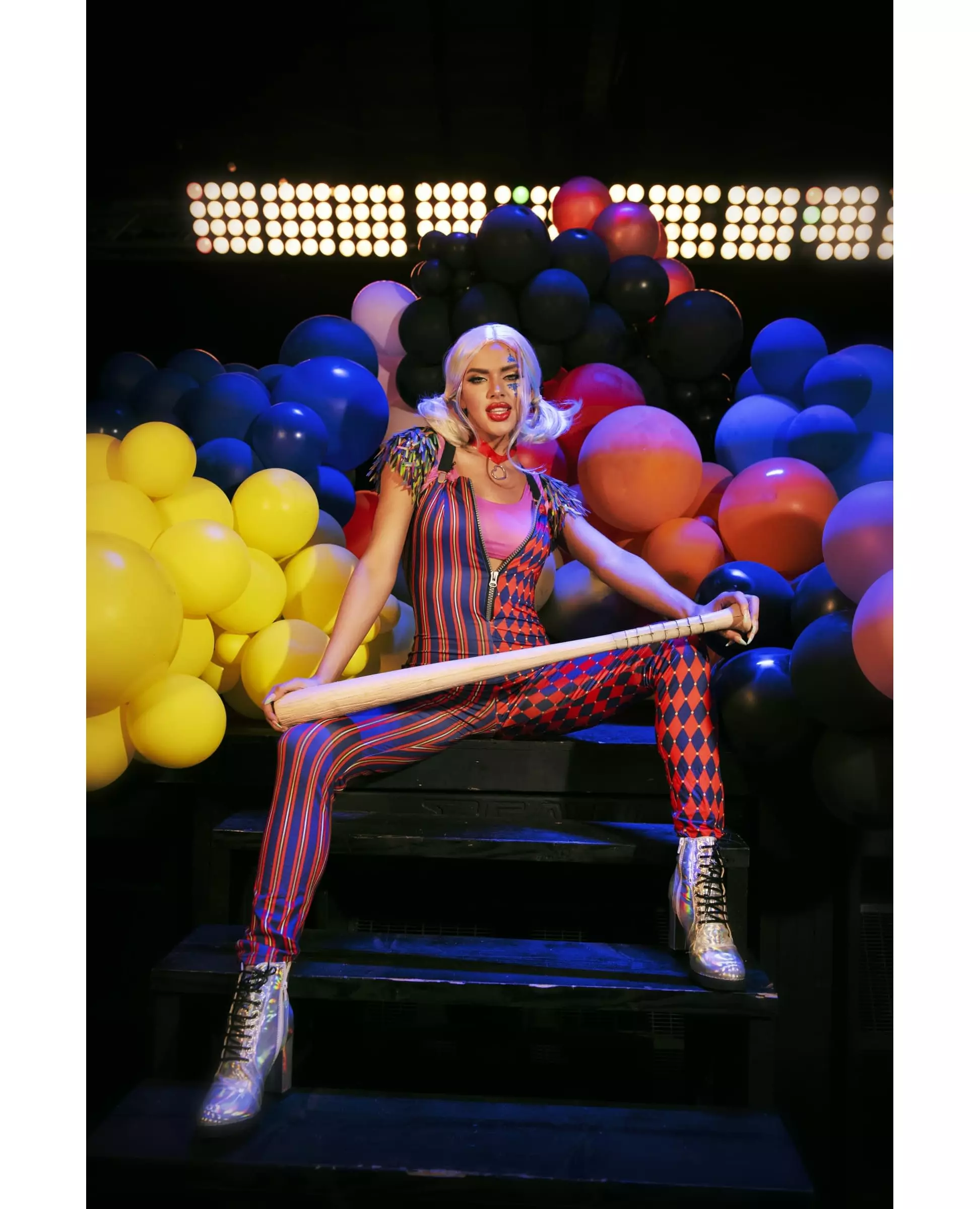 Play as an evil and troubled harlequin This deluxe troubled girl costume is for women. It consists of a top, a jumpsuit and a choker (wig and hammer not included). The top is a pink top with sleeves decorated with colorful confetti fringes. The jumpsuit, equipped with black straps, is also very colorful. One side is red with midnight blue diamonds and the other has vertical red, blue and yellow stripes. It opens and closes with a zipper, so you choose your style! Finally, a red choker with a silver heart-shaped pendant completes this set. This This deluxe evil harlequin costume will cause trouble on Halloween night, at your movie character themed costume parties or for a super villain themed party! Material: unknown. Accessories included: Jumpsuit with straps Confetti crop top Choker Care: Hand wash