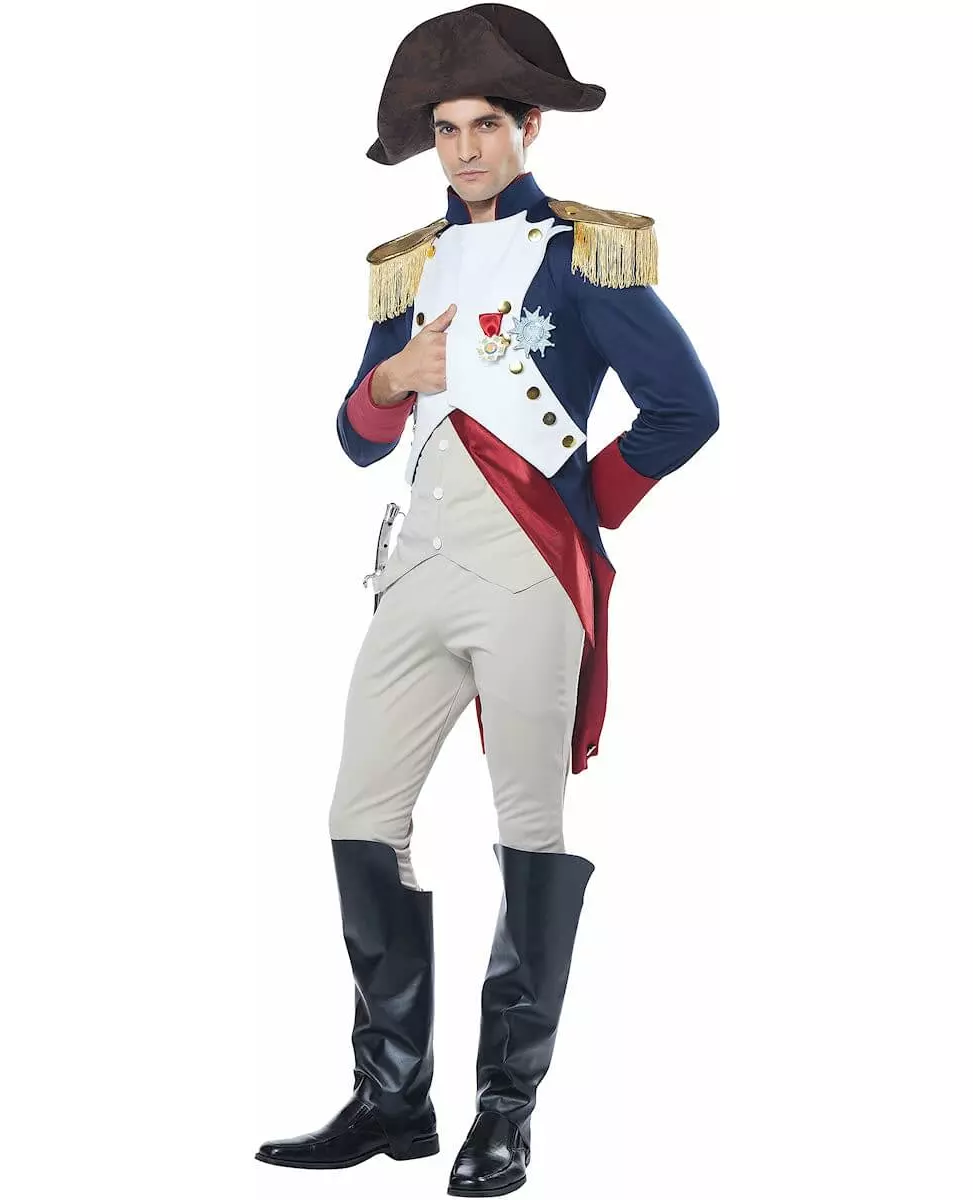 The day of glory has arrived! This Napoleon costume for men consists of a jacket, boot covers, pants, and a hat (shoes not included). The uniform jacket is blue with long sleeves and a white fabric breastplate, gold epaulettes, and red cuffs. The white pants are very comfortable to wear. A black hat, which makes you a real general, and fake boots that hide your shoes complete this historical costume. With this Napoleon costume, you will not fail to make a memorable appearance at Carnival, a reenactment, or a party. Theme!. Accessories included: Top Over-boots Pants Hat Material: 100% polyester Care: Hand wash