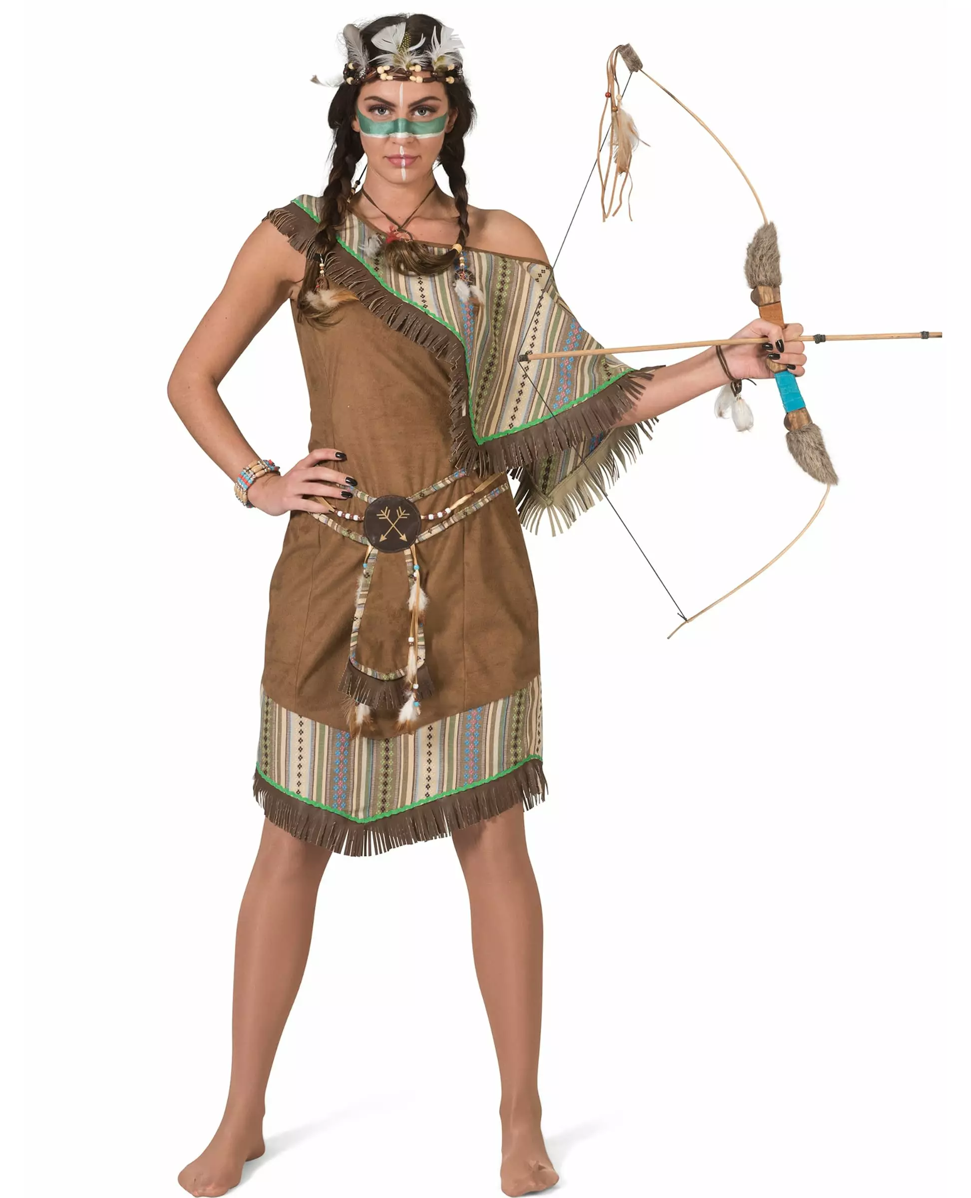 Luxury Indian dress costume for women Dress up as a more realistic Indian woman This Indian costume for women consists of a dress (headband, bow and arrow jewelry not included). The dress is brown, in a skin-like fabric Adult costume includes: Dress