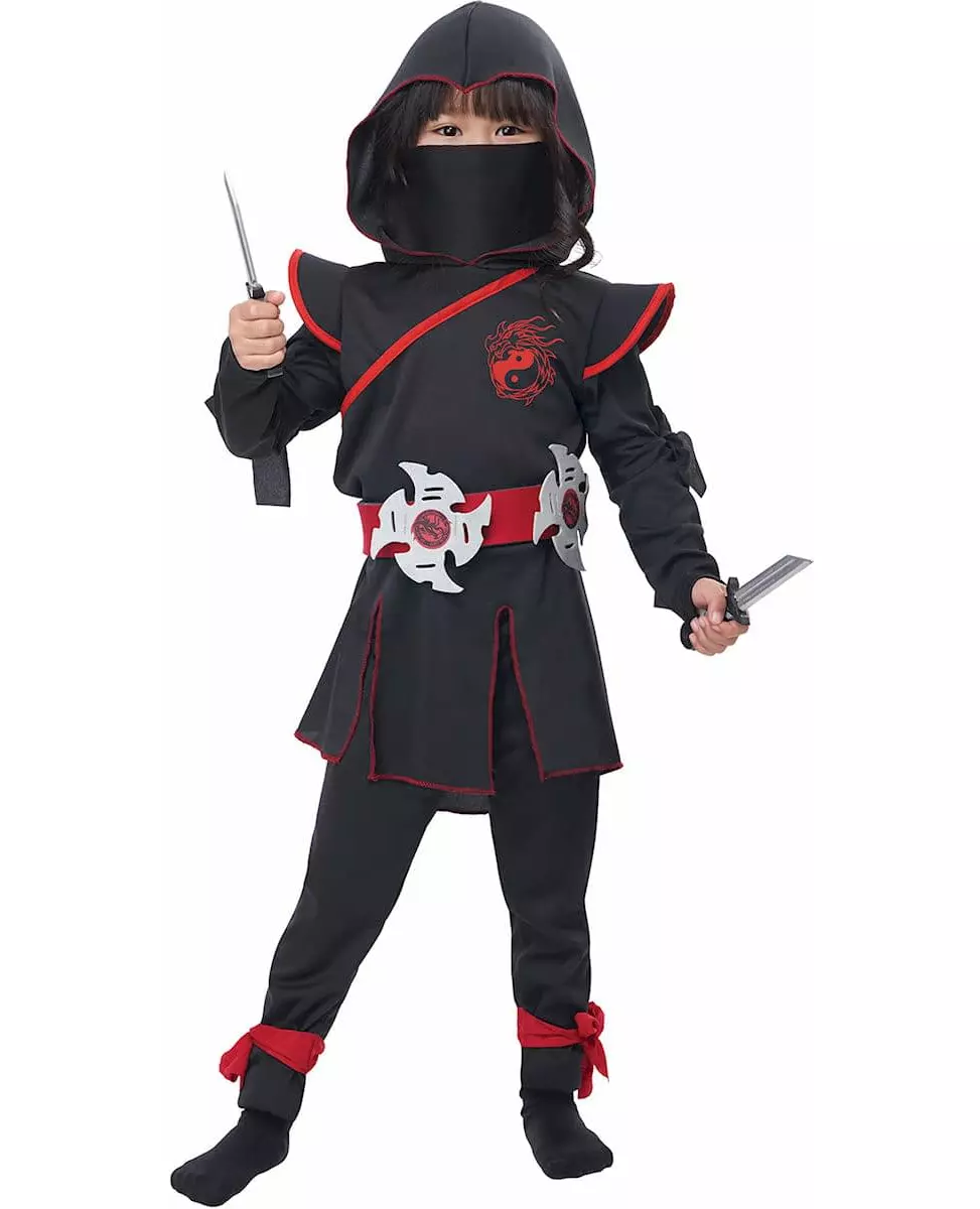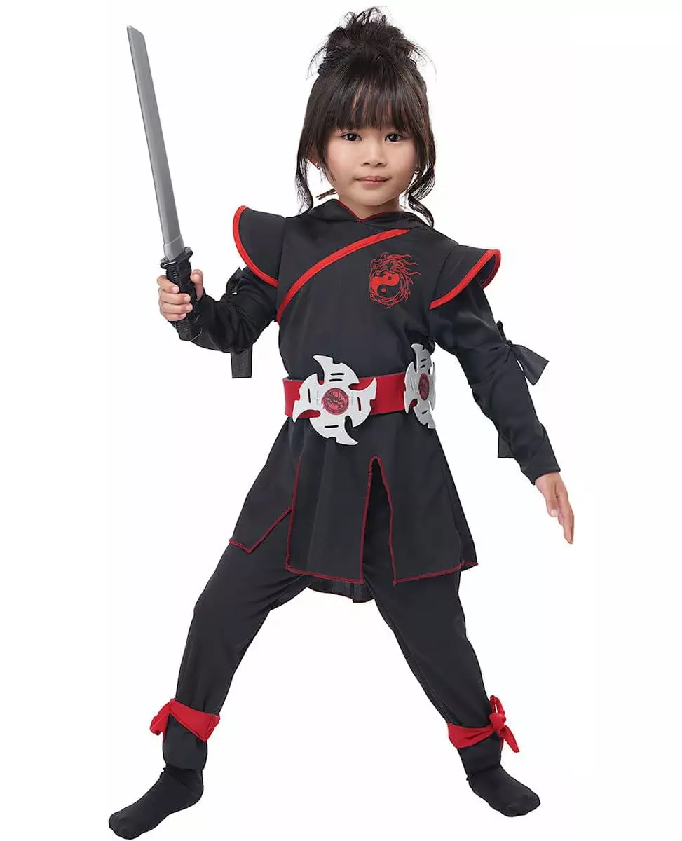 complete ninja costume! This ninja costume is for children. It consists of a tunic, leggings, a belt, a mask, a pair of arm ties and a pair of ankle ties (saber not included). The tunic is all black, with red details: piping and a yin and yang symbol on the chest. The rolled-up sleeves are reminiscent of ninja armor with long sleeves underneath and the tunic ends in large fringes from the waist. The leggings are all black and the red ties are added at the ankles while the black ties are tied on the arms. Finally, the red belt is decorated with gray symbols representing the ninja stars and the mask completes the ninja look by placing it over the mouth. A ninja more real than life with this ninja costume for children! It will be ideal for a fancy dress birthday on the theme of ninjas or for Carnival! Accessories included: Tunic Leggings Belt Mask Arm ties Ankle ties Care: Hand wash