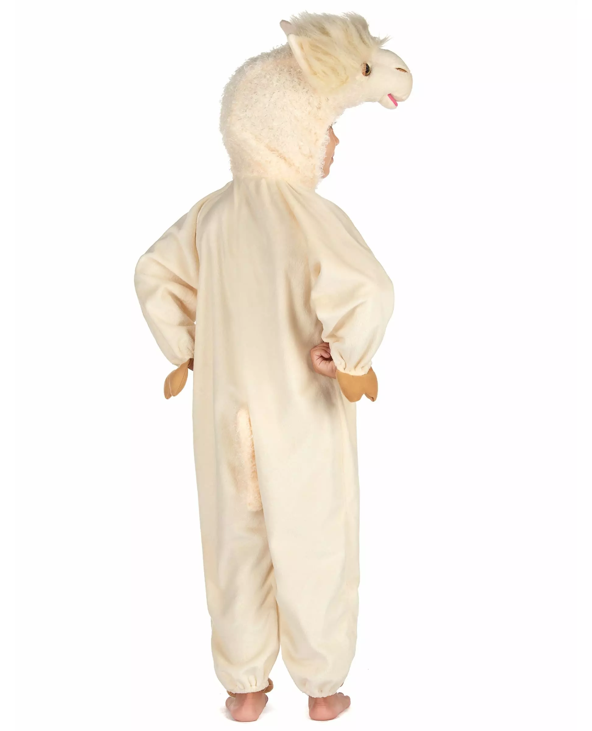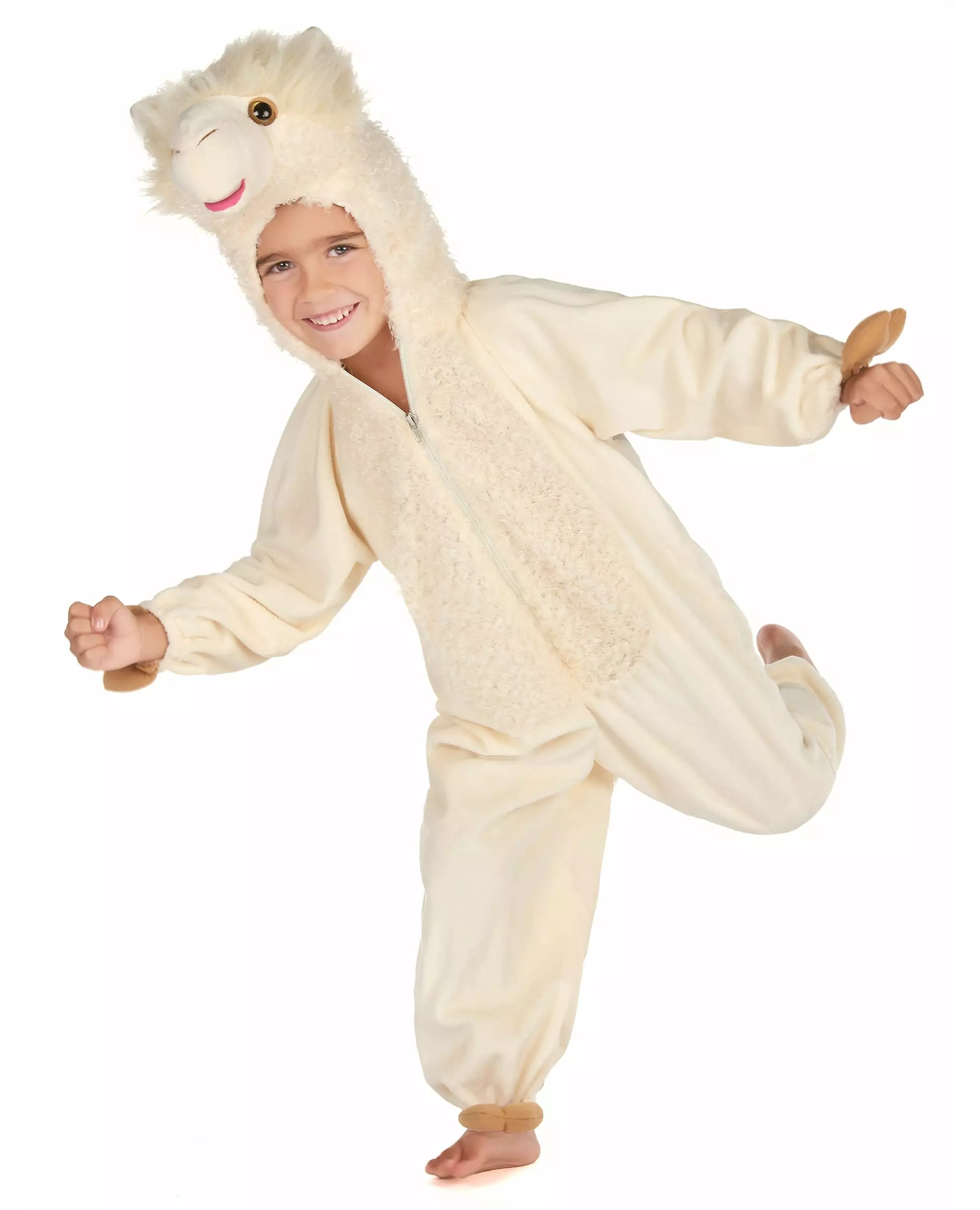 Become a real Llama! This llama costume is for children and includes a hooded jumpsuit. The jumpsuit is beige, with fake hooves on the hands and ankles. It has faux fur imitating that of the llama all over the chest. The hood represents an adorable little llama head. This jumpsuit opens and closes with a large zipper on the front. This quality costume will be perfect for an animal-themed costume party, for Carnival or simply as pajamas!. Accessories included: Jumpsuit Material: 100% Polyester Care: Hand wash