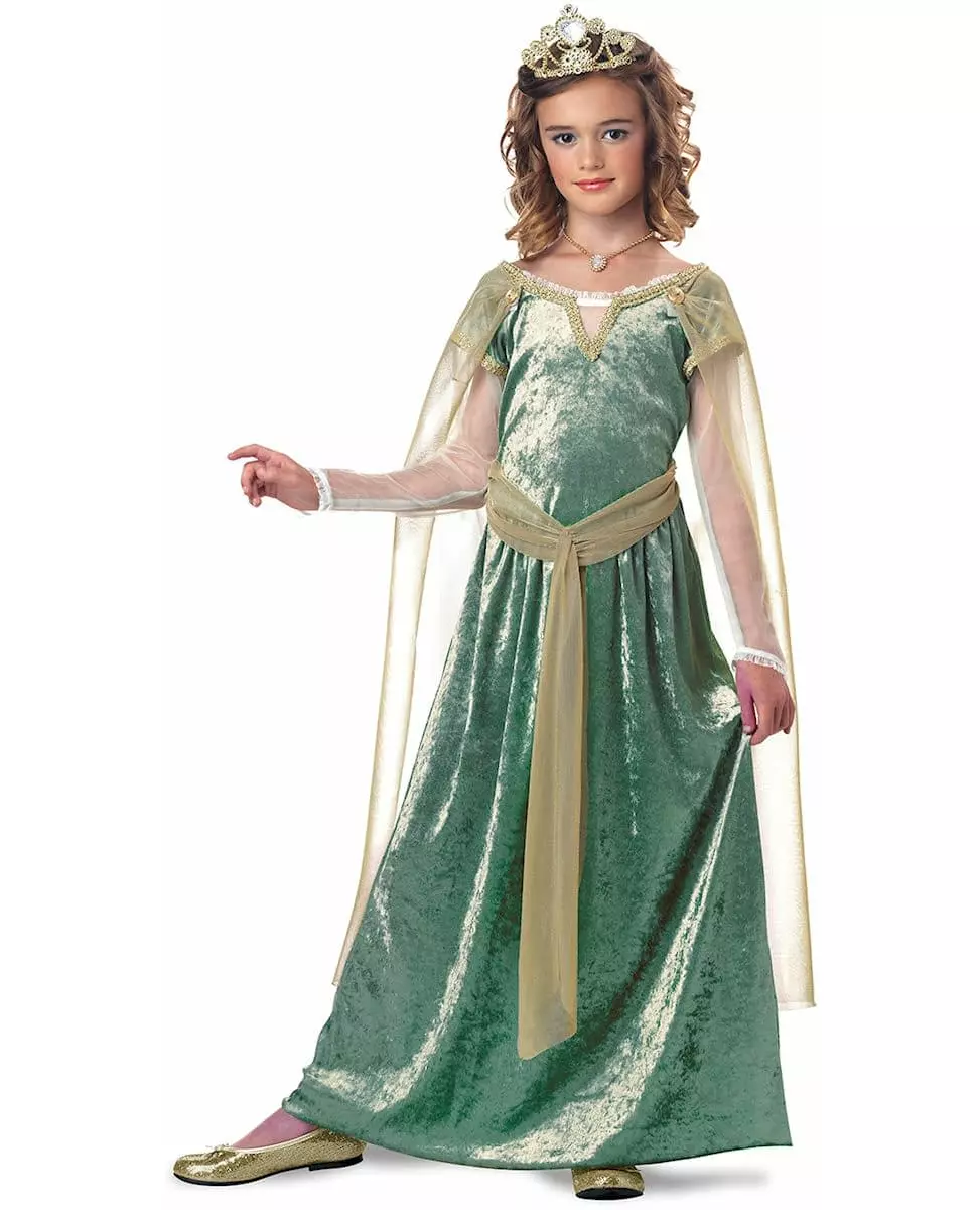 In this dress, your daughter will be a real princess This Queen Guinevere costume for girls consists of a dress, a cape, a belt and a crown. The medieval queen dress is made of pale green velvet-effect fabric. It is lined with gold-toned edging. A cape in beige-gold veil can be attached to the dress. A belt will mark the waist. It is made of the same beige veil. Finally, a princess crown completes this costume. It is made of gold plastic with a heart on the front. This costume will be perfect for embodying a sublime queen at on the occasion of a historic celebration.. Accessories included: Dress Cape Belt Crown Material: 100% Polyester Care: Hand wash