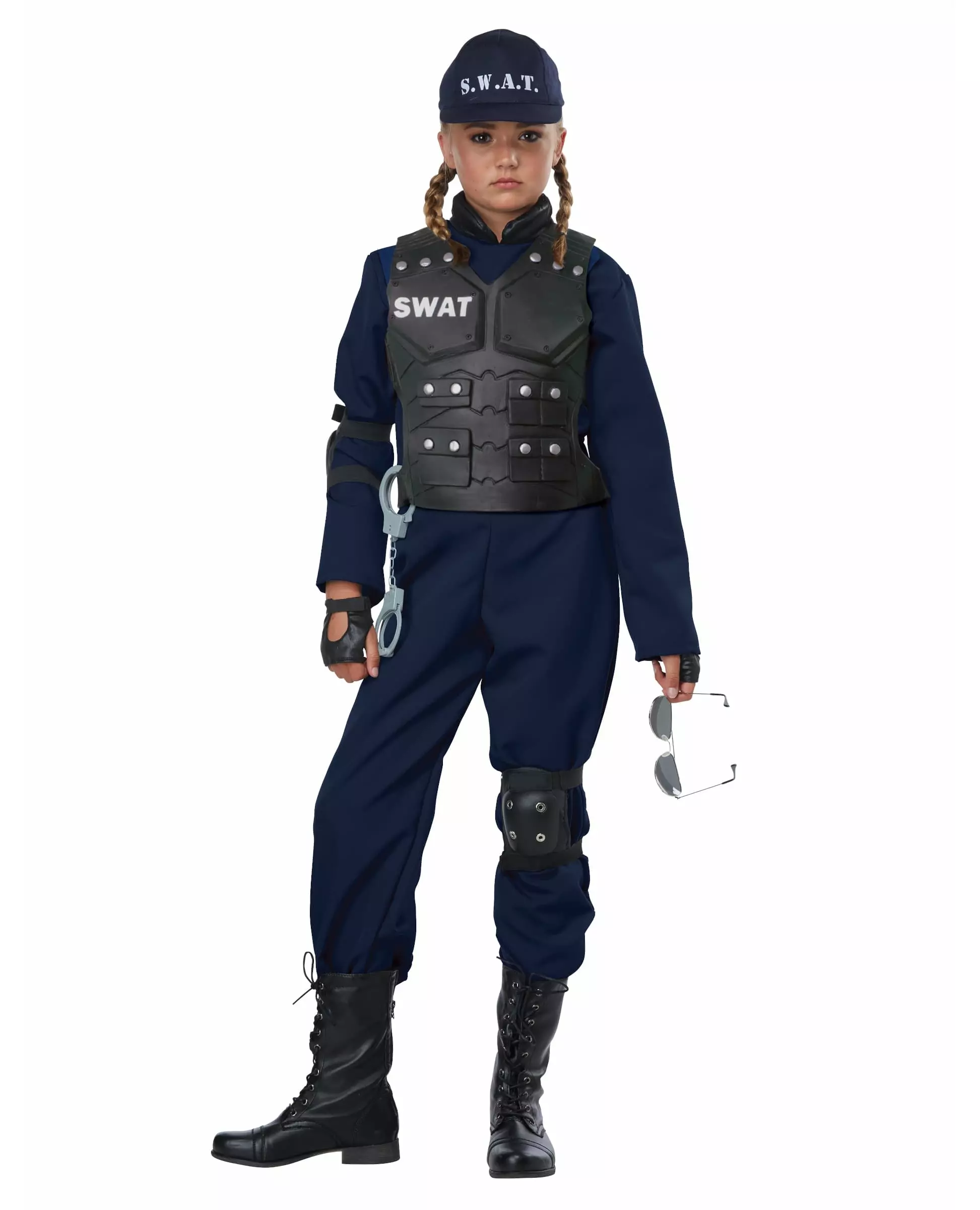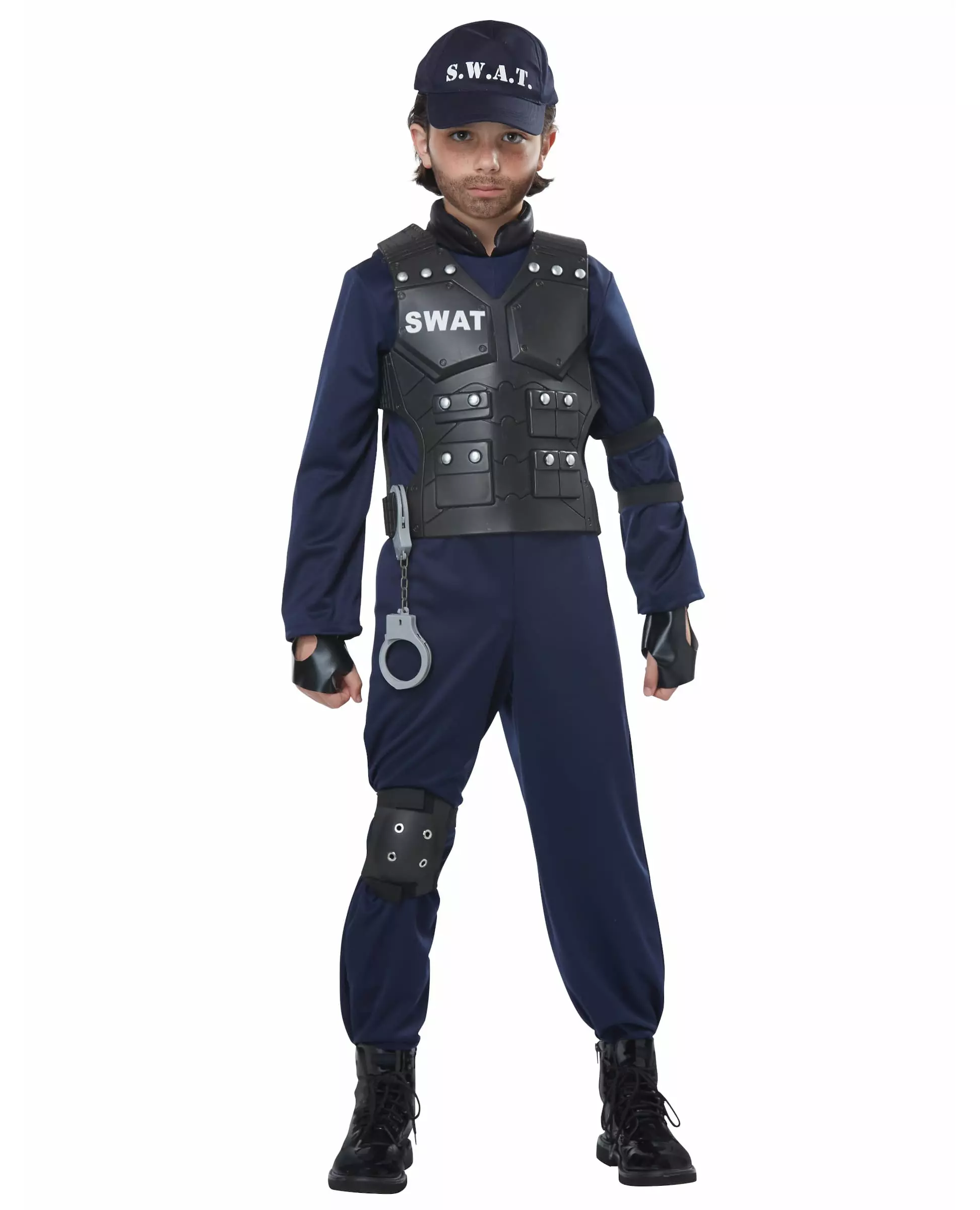 Cops and Robbers Night This SWAT costume for kids includes a jumpsuit, a vest, a pair of mittens, a knee pad, an elbow pad, a pair of handcuffs and a cap (goggles and boots not included). The long-sleeved jumpsuit and pants are midnight blue. The black vest is an imitation of a bulletproof vest with the inscription SWAT on the chest. A pair of cuffs and a knee pad to match the vest are also included. Finally, the midnight blue cap is printed with the inscription SWAT. This SWAT police officer costume will be perfect for Carnival or a party with a uniform and profession theme. Accessories included: Jumpsuit Vest, Gloves 2 mittens 1 knee pad 1 elbow pad 1 pair of handcuffs Hat Material: 100% polyester