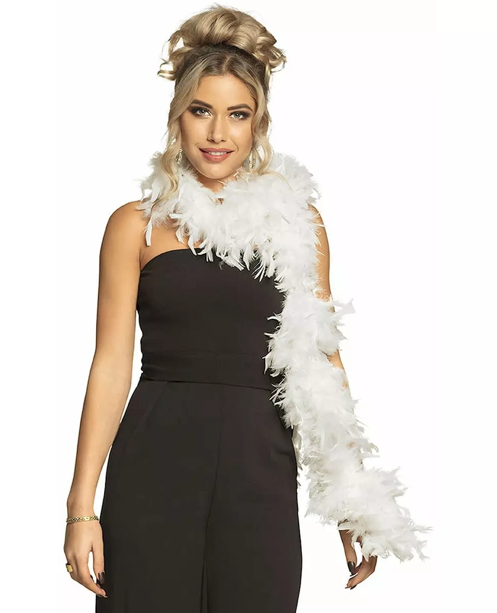 Add a touch of pure elegance to your outfit! This 80g white boa measuring 180cm is the ideal accessory to complete your look with a chic and refined touch. Its light texture and voluminous feathers give you an elegant and timeless style. Perfect for a theme party, a cabaret costume, or any festive event, this white boa matches all your outfits for a luminous and sophisticated effect. Easy to wear and soft to the touch, it is the essential accessory to bring charm and glamour to your all your special occasions.. Accessories included: 1 Boa Material: 98% turkey feather and 2% cotton