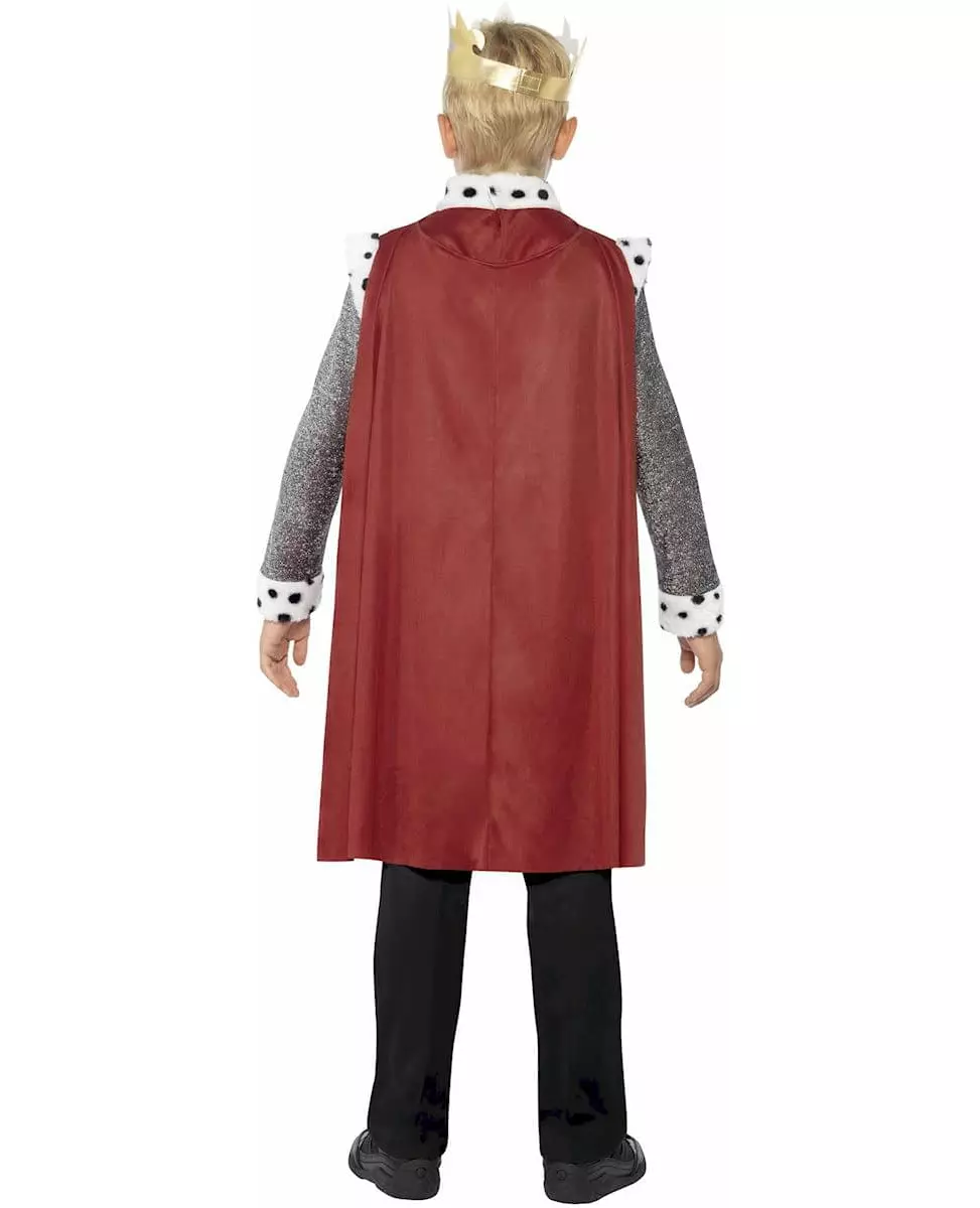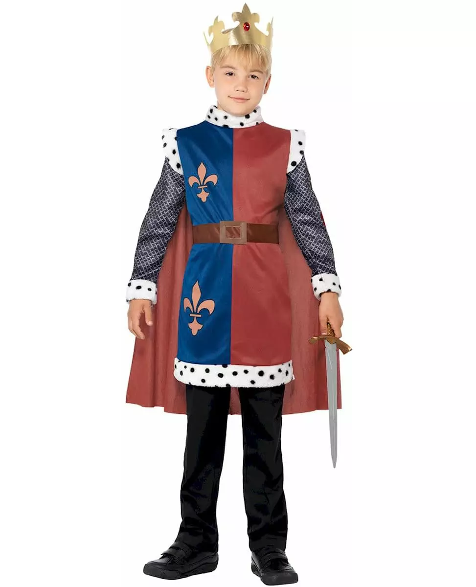 This medieval king costume for boys consists of a royal tunic, a crown, and a cape. The red and blue tunic is trimmed with white speckled fur. It closes with Velcro in the back. The brown belt is sewn onto the tunic. The red cape matches the tunic and attaches to it with Velcro. The golden crown completes this king's outfit. This costume is perfect for playing the king of the evening at birthdays or fancy dress parties. Accessories included: Tunic Crown Cape Material: 100% Polyester Care: Hand wash