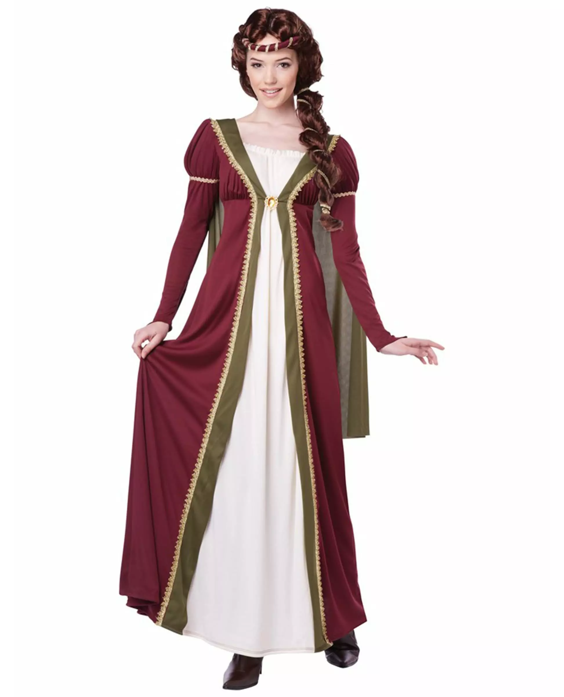 Get ready for a historical journey! This medieval costume for women consists of a dress with a cape and brooch, and a headdress (shoes and wig not included). The long, plum-colored dress features a faux long, off-white shirt with a pronounced neckline and a khaki green cape sewn at the shoulders. It is decorated with gold braid. A gold brooch with a faux stone hangs under the chest. The long, puffed sleeves at the shoulders are tightened with a gold elastic. This dress will easily slip on over the head. The headdress is a balso. It is made of a plum-colored sausage, decorated with a gold braid (it measures about thirty cm long) and ends with gold-colored ties that will allow you to attach it around your head. This medieval lady costume will be perfect for a party about the Middle Ages or for a fancy dress party. Accessories included: Dress Headdress Material: 100% Polyester Care: By hand
