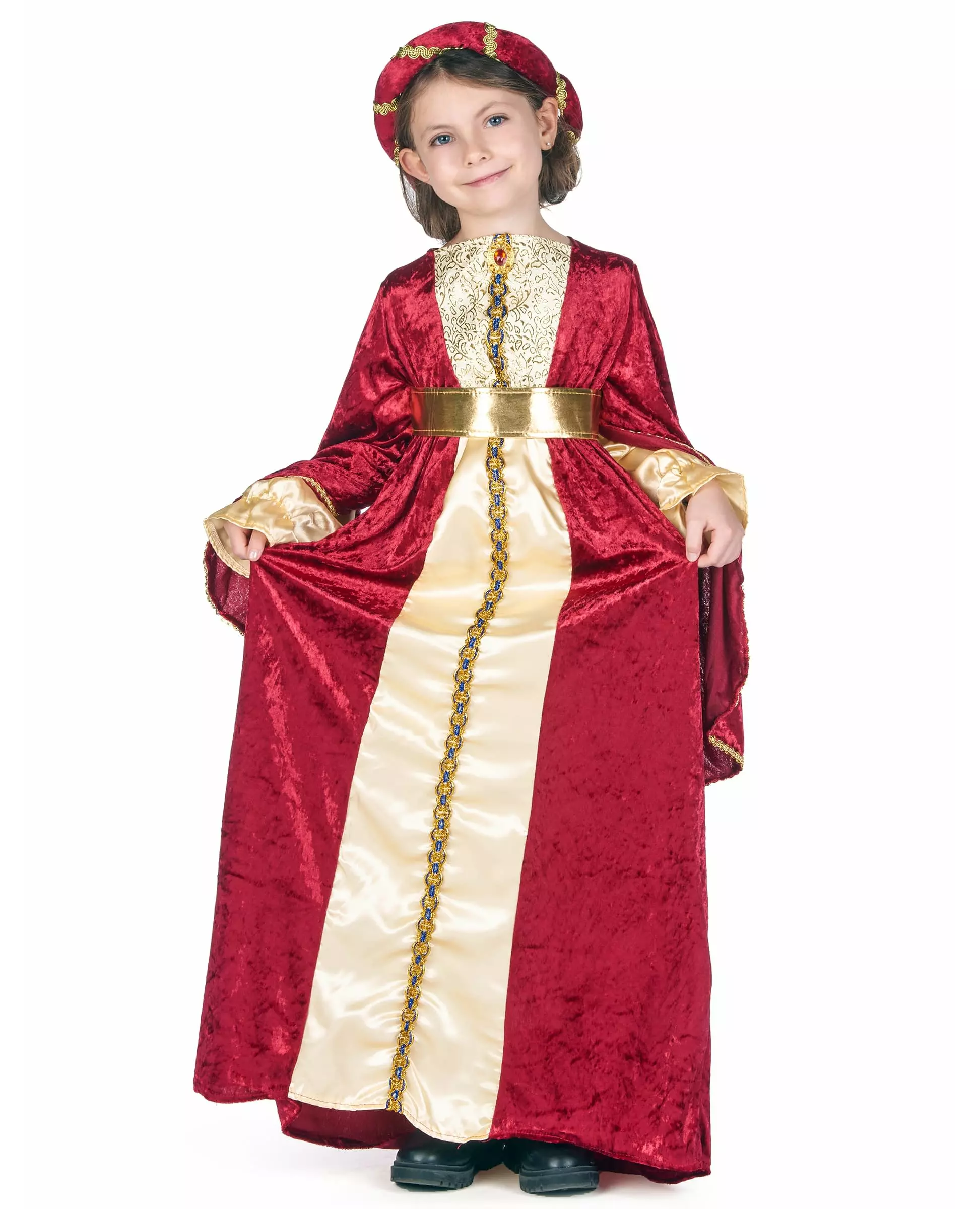 Very neat gold finishes! This medieval queen costume for girls consists of a beautiful dress, a headdress and a gold belt. The long, glamorous red and gold imitation velvet dress is edged with gold piping and faux embroidery, the gold sleeves are in imitation satin. The red and gold headdress is matching (shoes not included). This magnificent costume is ideal for medieval evenings, for a birthday party, a show or for Carnival. Accessories included: Dress Headdress Belt