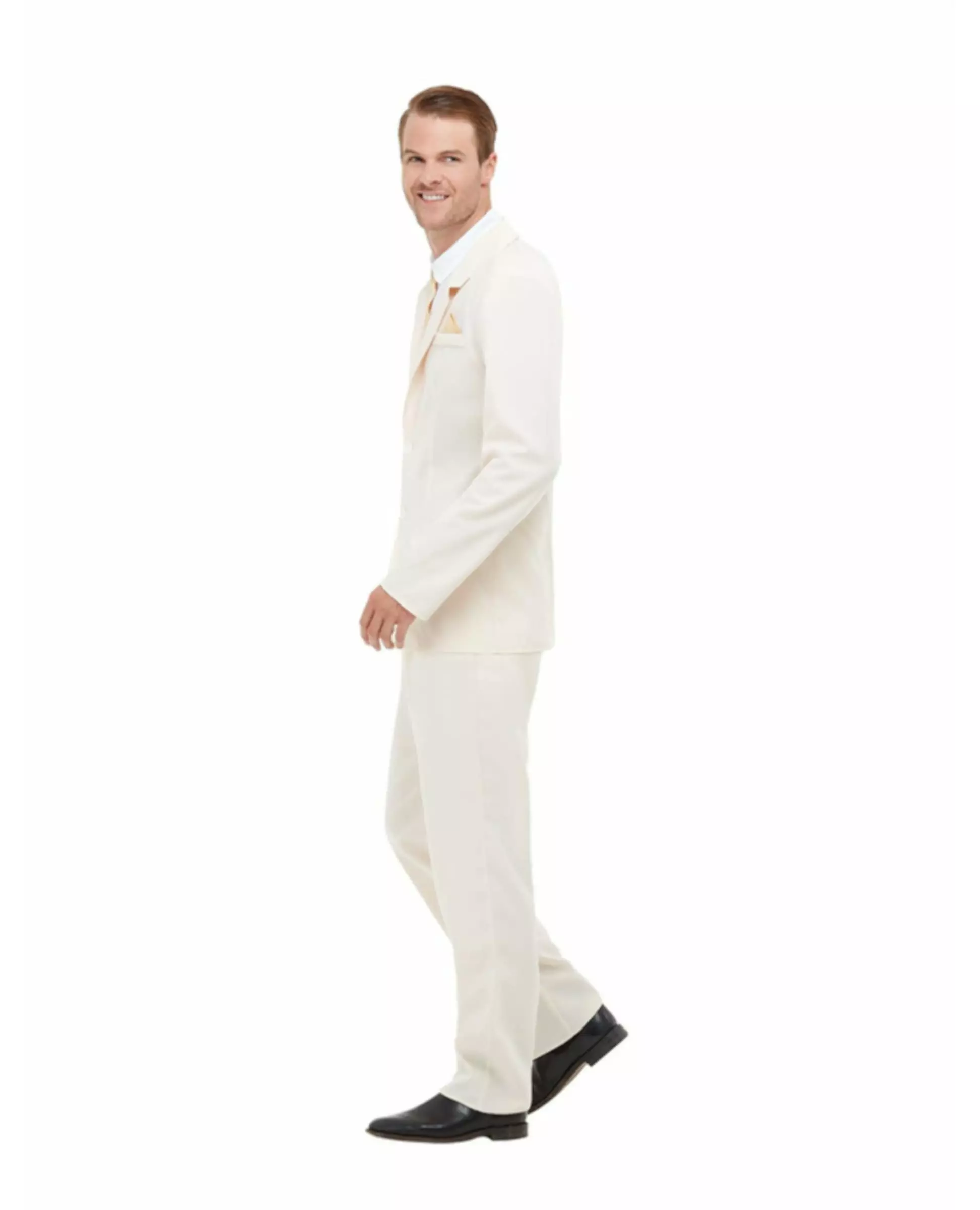 Choose the chic of a 1920s costume This 1920s gentleman costume for men consists of a jacket, trousers, and a breastplate (beard, cane, and shoes not included). The suit jacket is white with faux pockets on the sides and chest. It fastens with buttons on the front. This jacket is completed with a breastplate. This will give the illusion that you are wearing a shirt, waistcoat, and tie under your jacket. Finally, the suit trousers are white to match the jacket. This complete costume will give you a very chic look at your 20s party. Accessories included: Jacket Breastplate Trousers Material: 100% Polyester Care: Hand wash