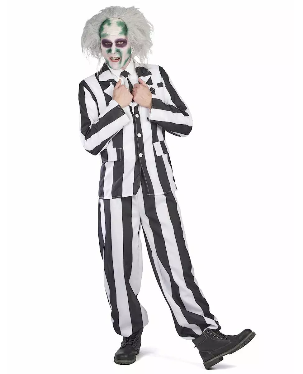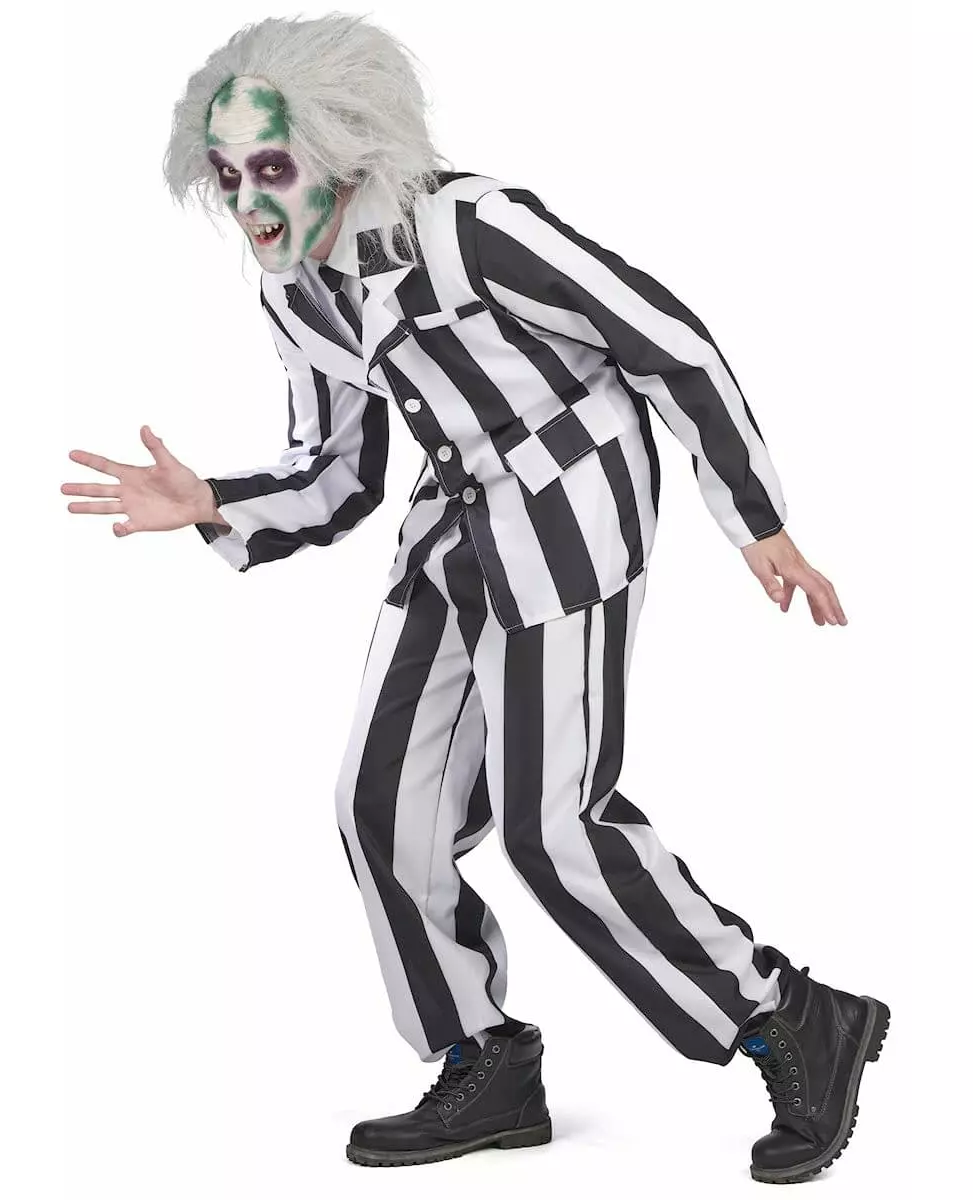 Transform yourself into the famous ghost this Halloween! This black and white striped ghost costume for adults includes a jacket, trousers, and a tie. Inspired by the look of the iconic ghost from the movies, the jacket and trousers feature vertical black and white stripes, offering a spooky and recognizable style. The jacket, with long sleeves, has two buttons at the front for easy fastening and is decorated with faux pockets, reinforcing the classic look of the costume. The trousers, perfectly matching, are comfortable and suitable for costume parties. The costume is completed with a black and white tie, adding an elegant touch to the costume. Perfect for Halloween, themed parties or fancy dress events, this complete costume will transform anyone into a sinister yet iconic character!. Accessories included: 1 Jacket 1 Tie 1 Trousers Material: 100% Polyester
