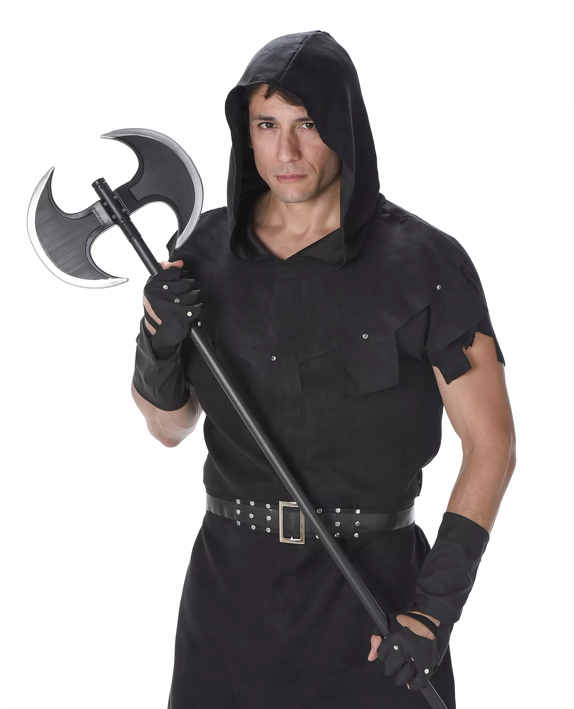 Transform yourself into an executioner in this dark costume. This executioner costume for men consists of a tunic, a belt, a pair of mittens, and overshoes. The black, leather-effect tunic has short sleeves and a hood. It closes at the top of the back with a Velcro fastener. It is completed by a belt, which also closes at the back with a Velcro fastener. The long mittens are black. They are open on the tops of the hands. The overboots are black. Leather-effect at the front, they are made of black fabric at the back. They are held under the feet with an elastic band. This costume will be perfect to terrify your friends on Halloween night. Accessories included: Tunic Belt 2 Gloves 2 Overshoes Material: 100% Polyester Care: Hand wash Measurement information: For size M, tunic approximately 102 cm long (excluding hood)