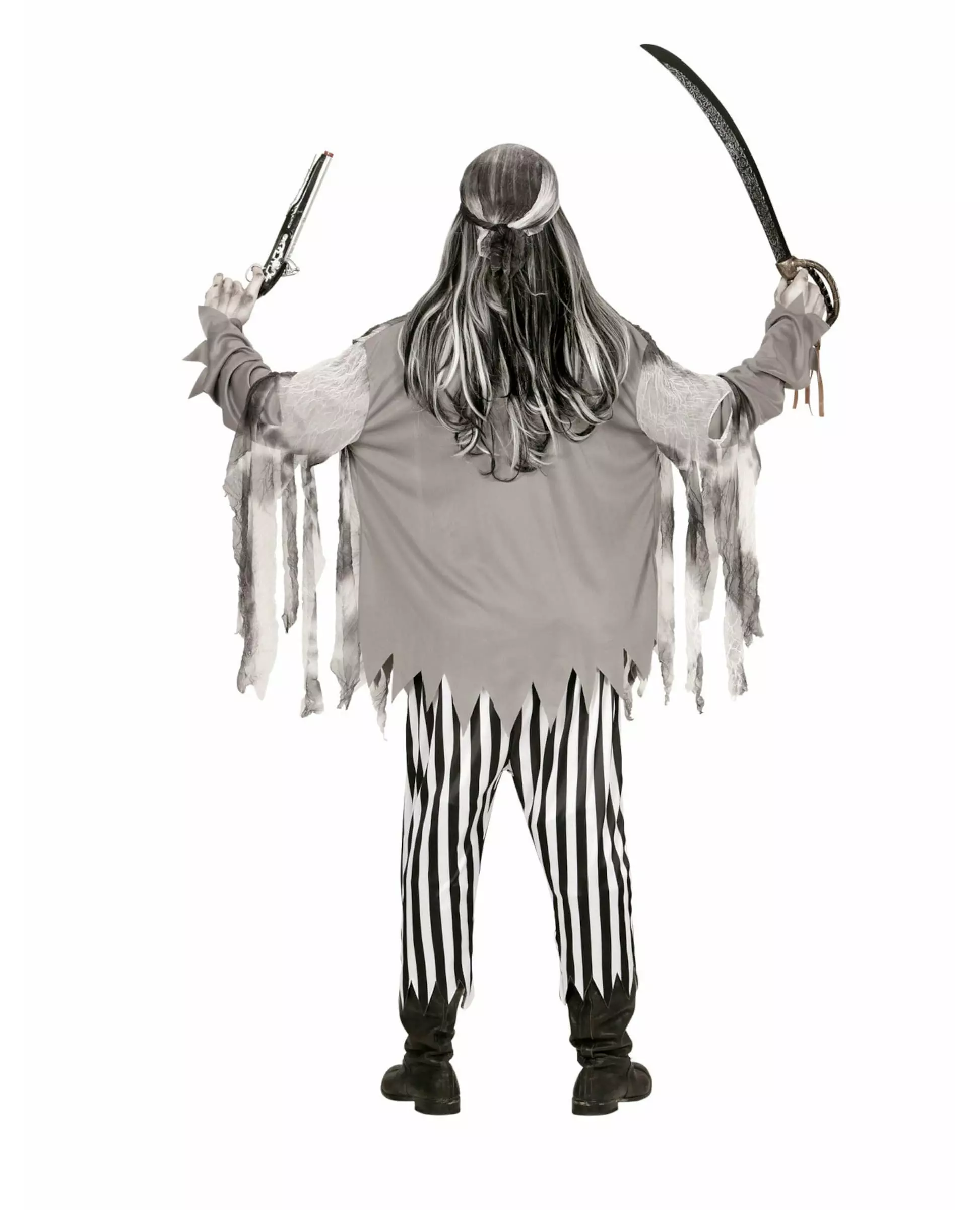 The Ghost Corsair This ghost skeleton pirate costume is for men. It is composed of a top, a jacket, pants and an eye patch. The top of the costume is composed of a black satin top with an imitation skeleton pattern in the center. The costume is accompanied by a silver-gray veil cut into strips that perfectly covers the whole. The pants are white and black with a ripped finish on the bottom. Finally, to enhance the whole look, an eye patch is added to perfect the ghost pirate outfit. This complete skeleton pirate costume will be perfect for scaring and spreading an icy wind during your Halloween parties! Accessories included: Top Jacket Pants Eye patch Material: 100% Polyester Care: Hand wash