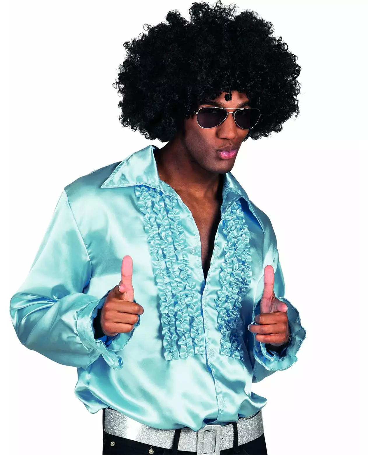 Let yourself be guided by the disco rhythm This men's disco shirt is light blue. Satiny, it is decorated with frills on the front. This shirt closes at the front with transparent plastic buttons. This will be perfect to complete your disco outfit for a 70s/80s themed costume party. Accessories included: Shirt Material: 100% Polyester Care: Hand wash