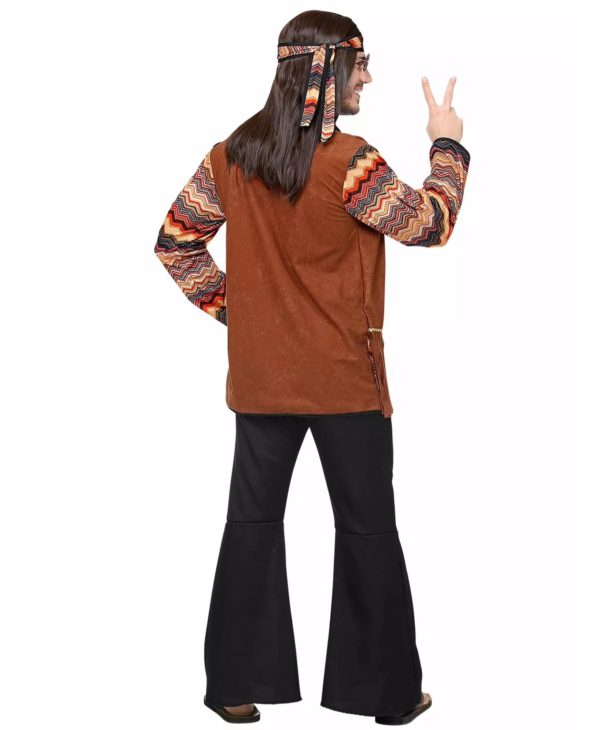 In this hippie costume, you'll be at the height of zen! This men's hippie costume consists of a top with a jacket, pants, a headband, and a necklace. The top has a colorful zigzag pattern. A brown vest is sewn directly onto the top. The pants are solid black and flared at the bottom. Finally, a headband and a necklace complete this costume. The headband is made of the same fabric as the top and is tied around the head. The necklace has a peace and love symbol pendant. This very complete costume will be perfect for your fancy dress party. Accessories included: Top with vest Pants Headband Necklace Material: 100% Polyester Care: Hand wash