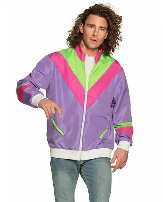 Rediscover the colorful look of the 80s with this jogging jacket. This 80's jogging jacket is for men. It is purple, with wide green and pink stripes on the collar and sleeves. It also has fake pockets on the sides. The jacket closes with a zip on the front. It will be perfect to complete your 80s outfit for Carnival or for a kitsch evening. Accessories included: Jacket Material: 100% Polyester Care: Hand wash